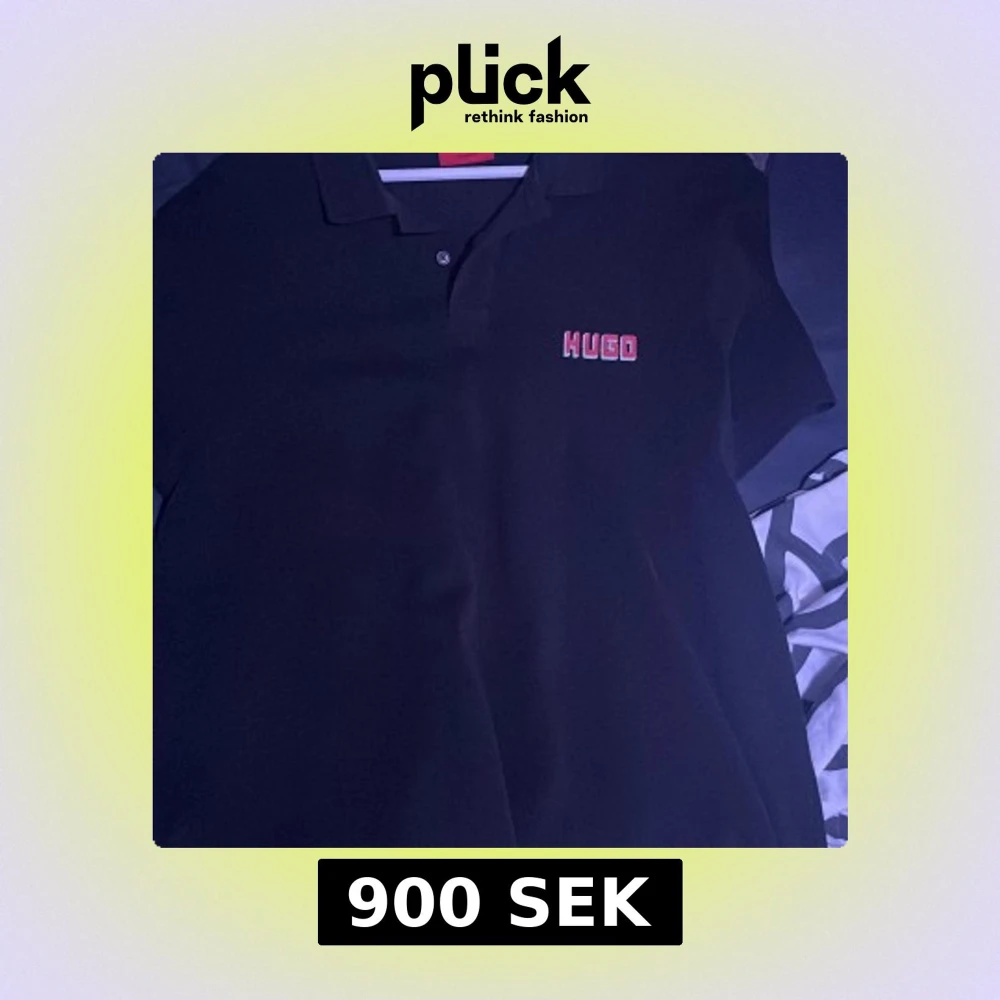 Svart pikétröja från Hugo med röd logotyp broderad på bröstet. Klassisk krage och knappslå framtill. Tröjan har en clean och stilren look, perfekt för dig som gillar enkel design med en touch av branding. Äkta Hugo boss köpt för 1900