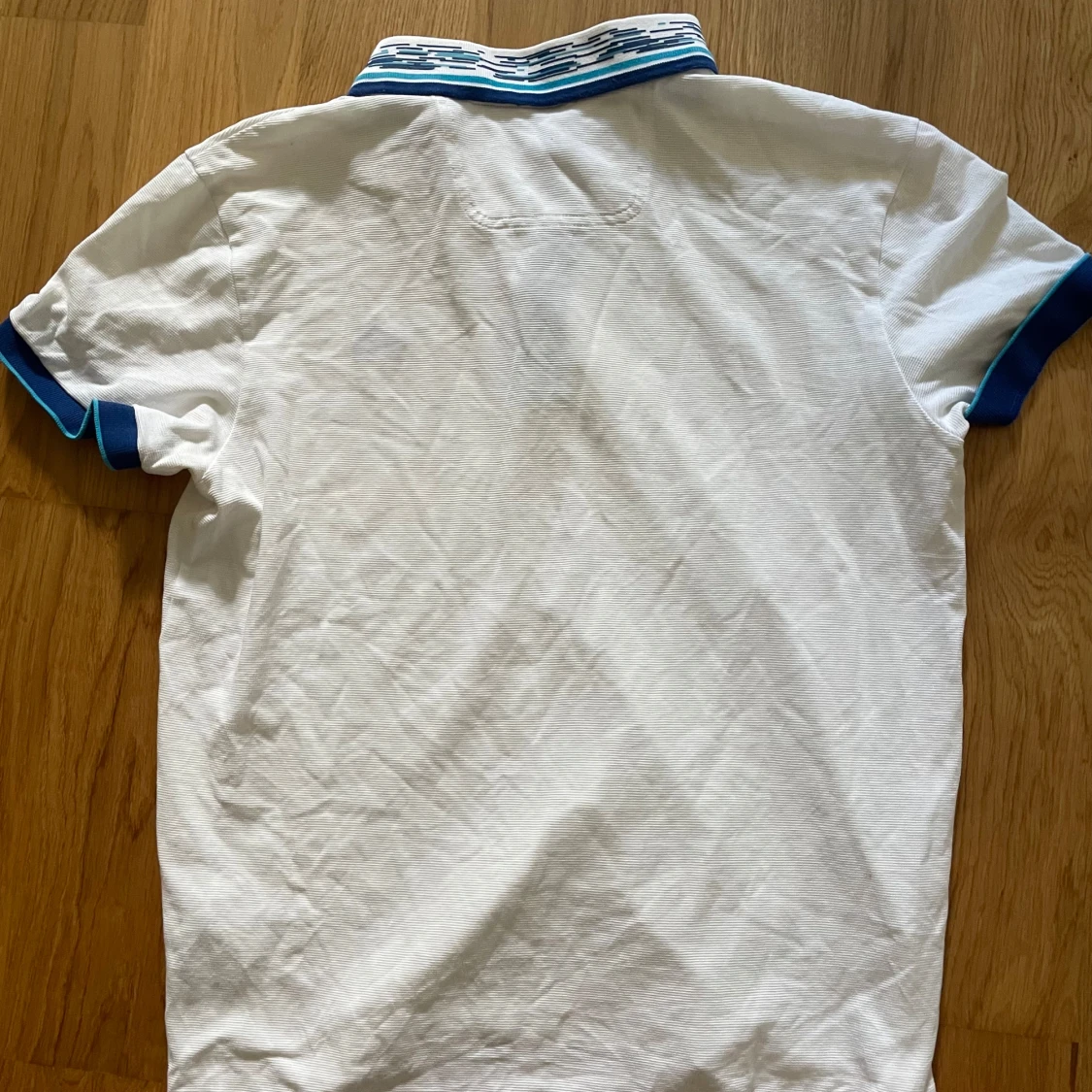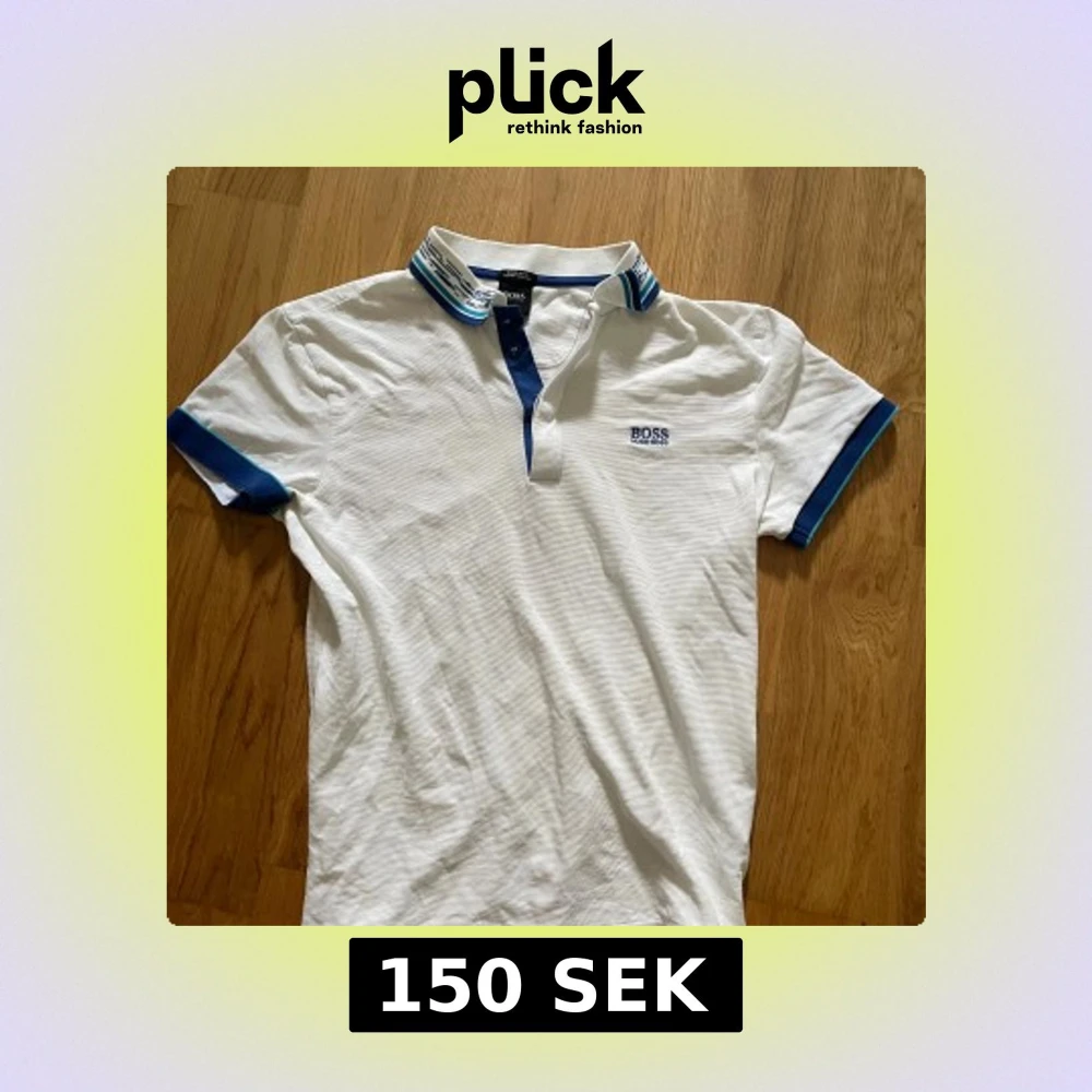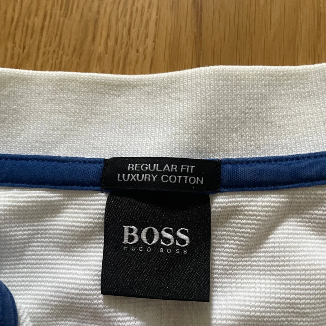 Snygg vit pikétröja från Hugo Boss med blå och turkosa detaljer på krage och ärmslut. Den är i bra skick, behöver bara strykas lite. Storleken är S och skulle säga att den sitter true to size. Hör av er vid andra frågor 🙏