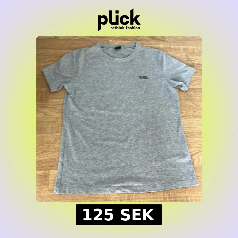 Säljer en stilren grå t-shirt från Hugo Boss med broderad logga på bröstet. Perfekt för en avslappnad look. T-shirten är kortärmad och gjord i mjukt material.