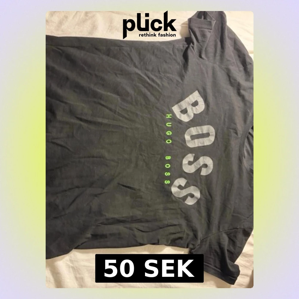 Svart t-shirt från Hugo Boss med stort BOSS-tryck i grått och grönt framtill. Klassisk rund halsringning och korta ärmar. Perfekt för en stilren och avslappnad look.