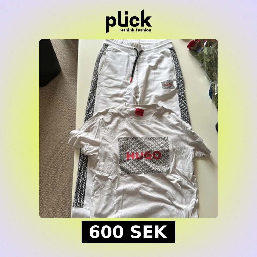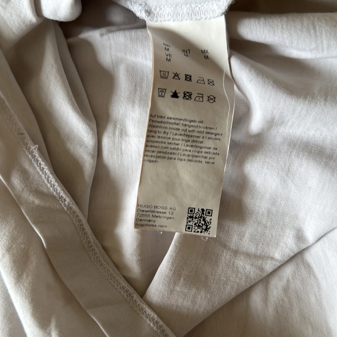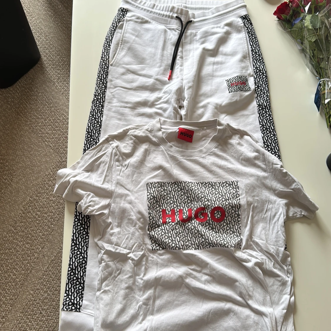Vit t-shirt från Hugo Boss med stor röd HUGO-logga på bröstet och svartvitt mönster runt loggan. Klassisk passform och rund halsringning. Perfekt för dig som gillar stilrena och trendiga plagg.