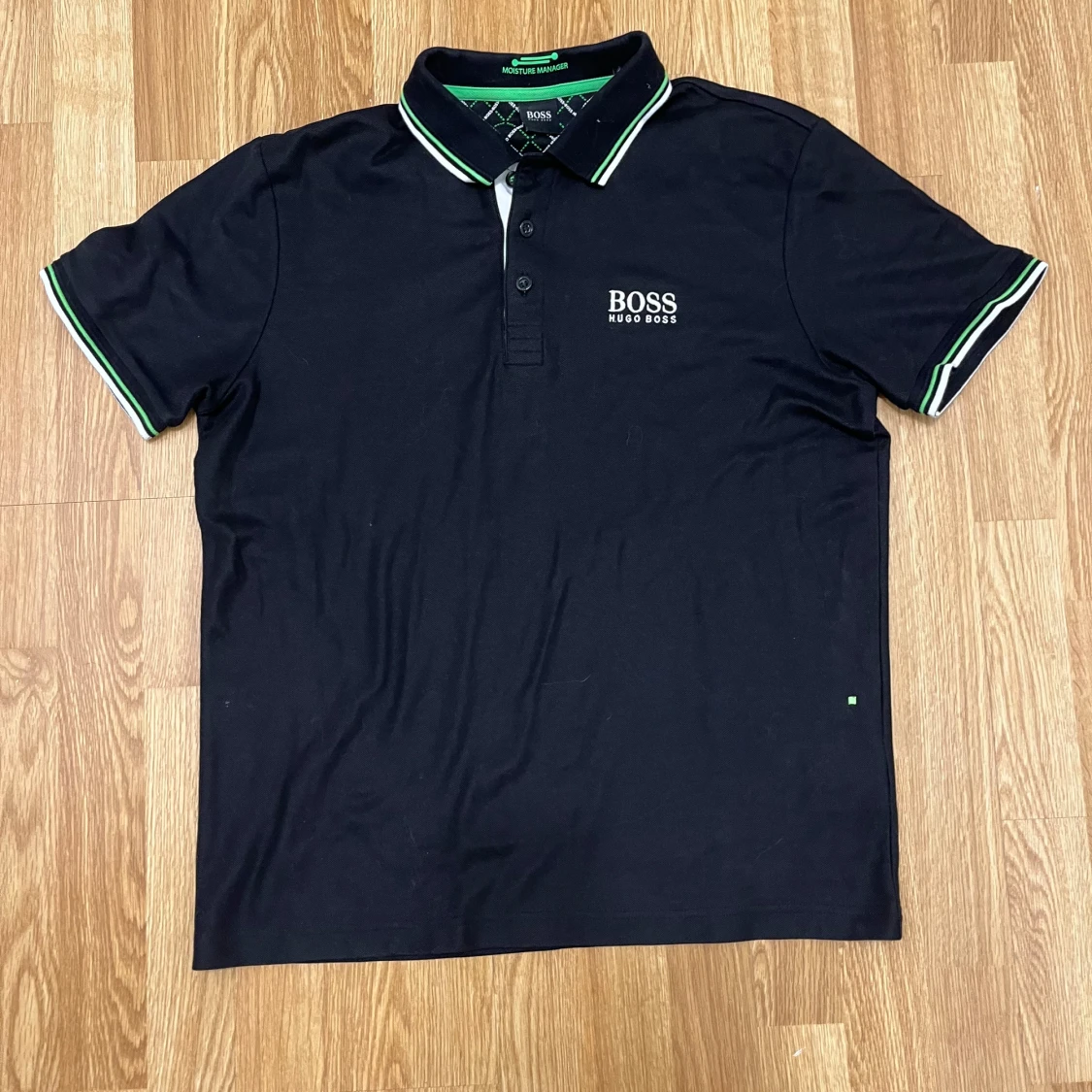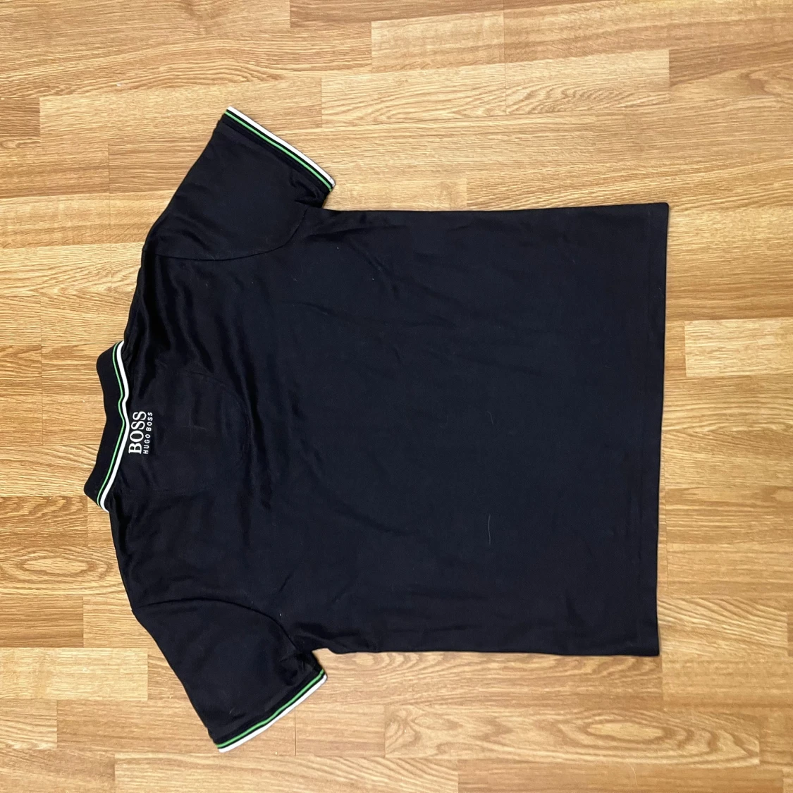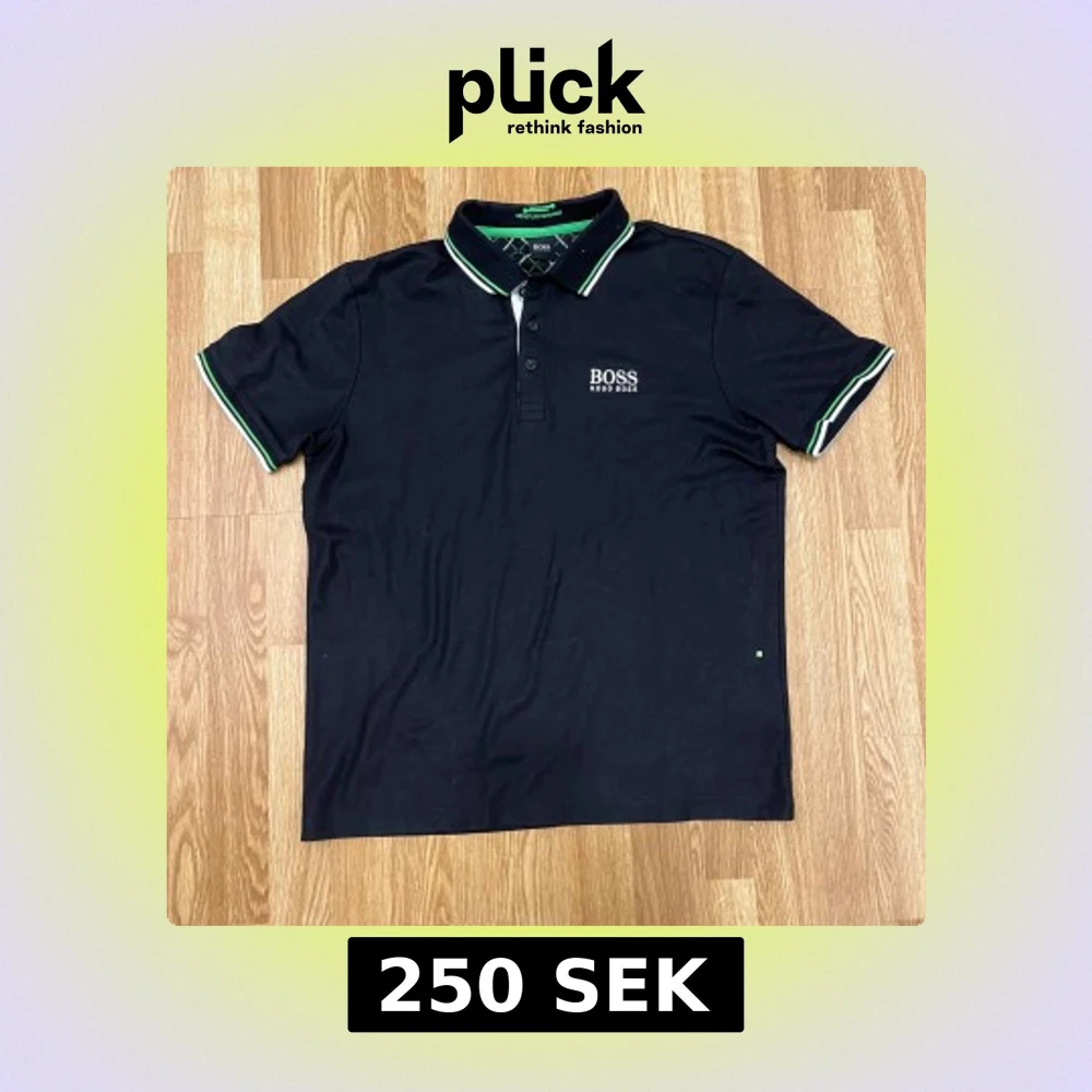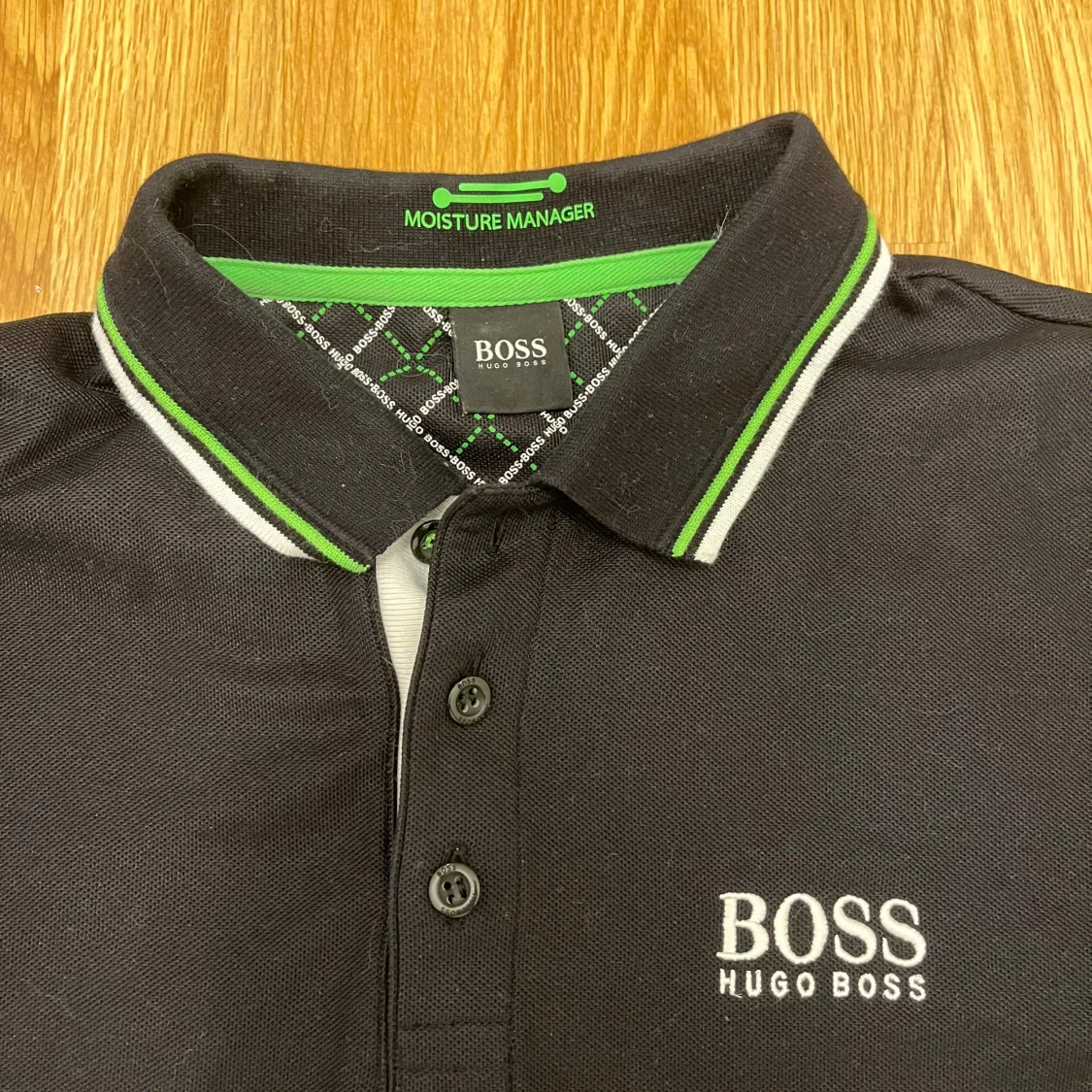 Snygg svart pikétröja från Hugo Boss med vit och grön rand på krage och ärmslut. Klassisk polokrage med knappar och broderad logga på bröstet. Tillverkad i bomull för en skön och luftig känsla. Perfekt för en stilren och sportig look.