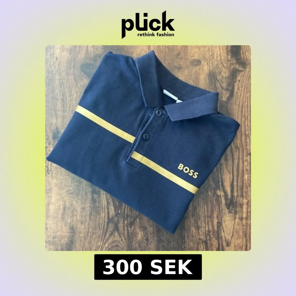 Mörkblå BOSS piké med gul detalj och logga. Storlek S (14 år) men passar som XS/S i vuxenstorlek beroende på fit. Stilren och sportig look – perfekt till sommaren eller en casual outfit. I fint skick, inga fläckar eller hål.