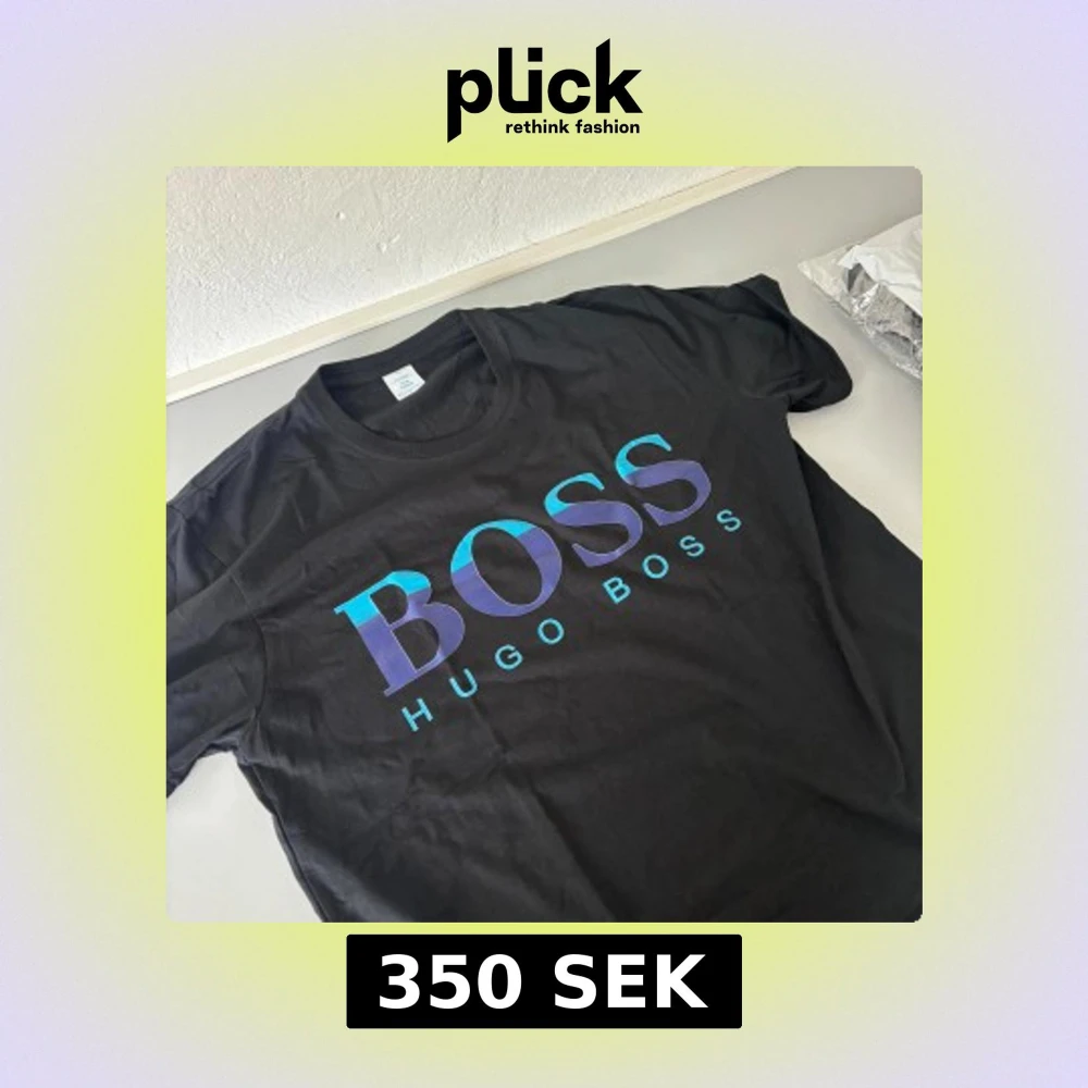 Snygg svart t-shirt från Hugo Boss med stor logga i blått och lila framtill. Klassisk rund halsringning och normal passform. Perfekt för dig som gillar stilrena och trendiga plagg med tydlig branding.NySKICK! STRL XL. Passar större varianten av L