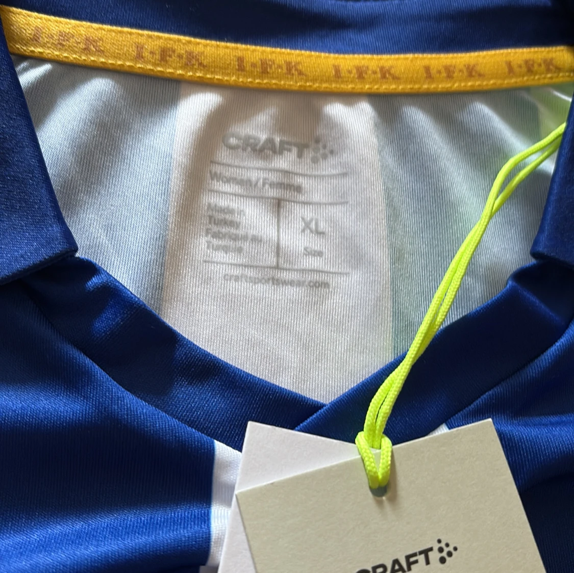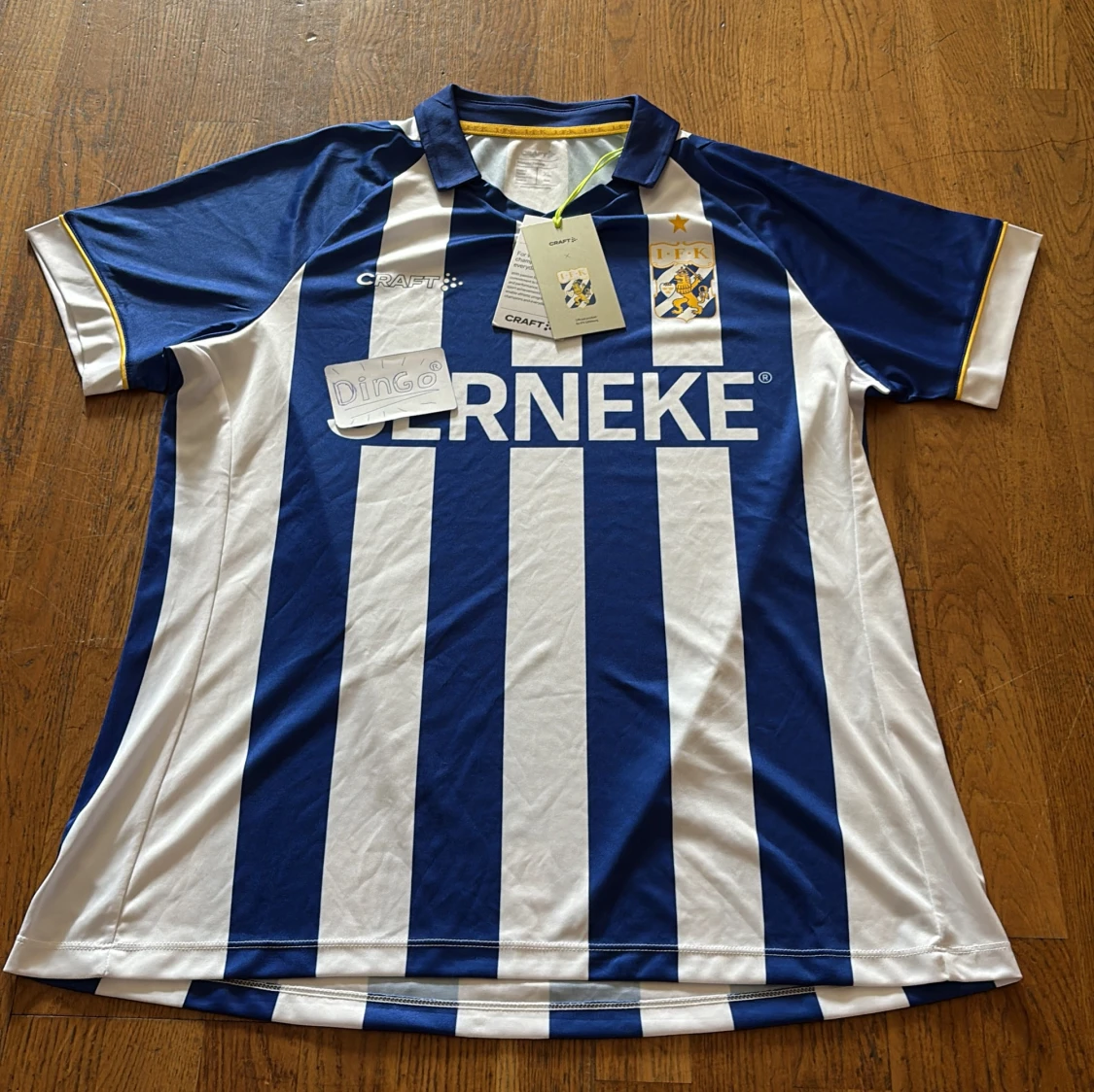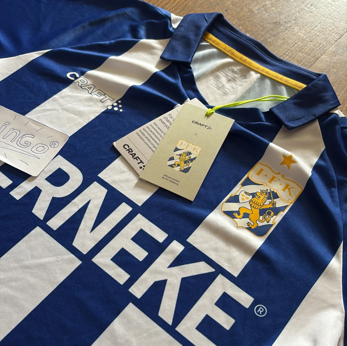 Säljer en officiell IFK Göteborg fotbollströja från Craft i blått och vitt med klubbmärke och sponsortryck. Tröjan har klassiska vertikala ränder, krage och korta ärmar. Perfekt för dig som vill visa ditt stöd på läktaren eller hemma.