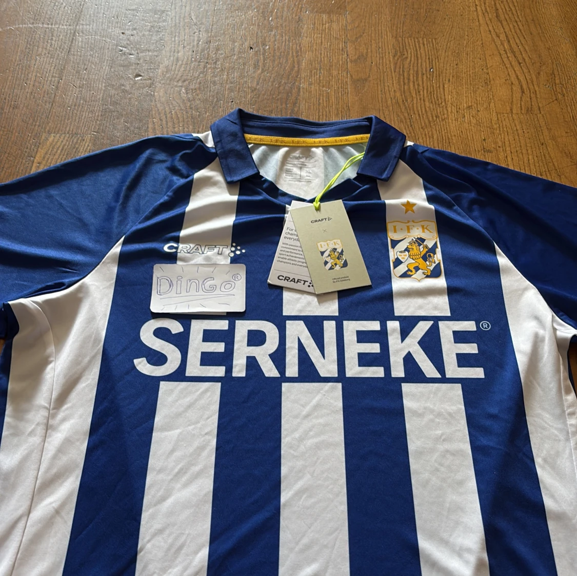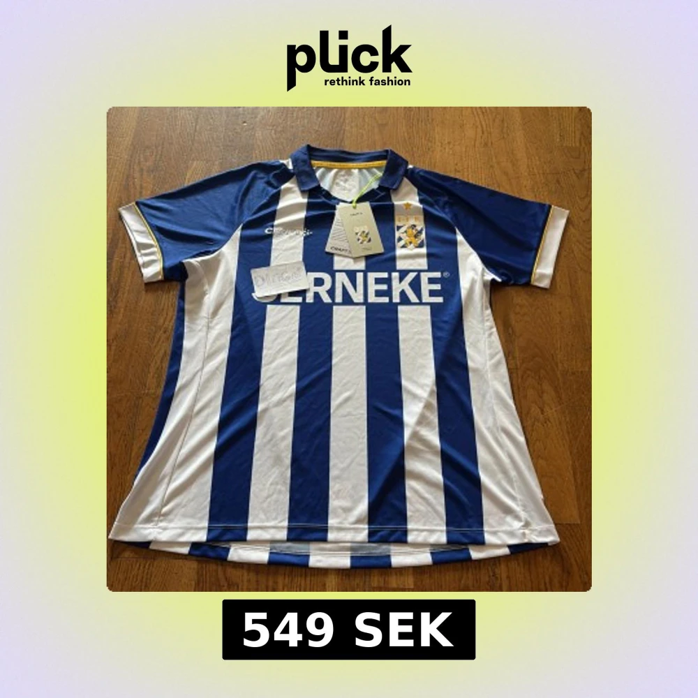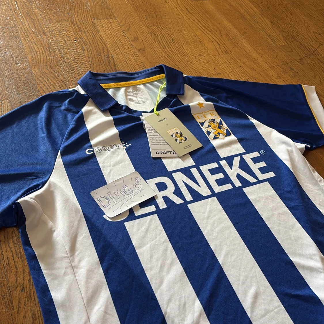 Säljer en officiell IFK Göteborg fotbollströja från Craft i blått och vitt med klubbmärke och sponsortryck. Tröjan har klassiska vertikala ränder, krage och korta ärmar. Perfekt för dig som vill visa ditt stöd på läktaren eller hemma.