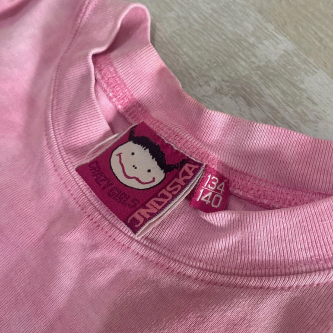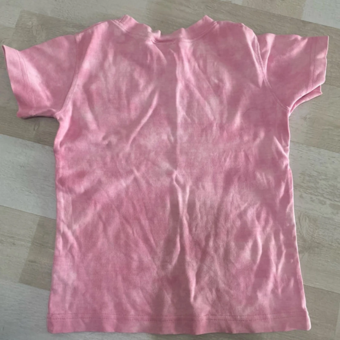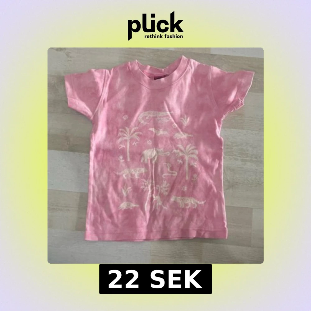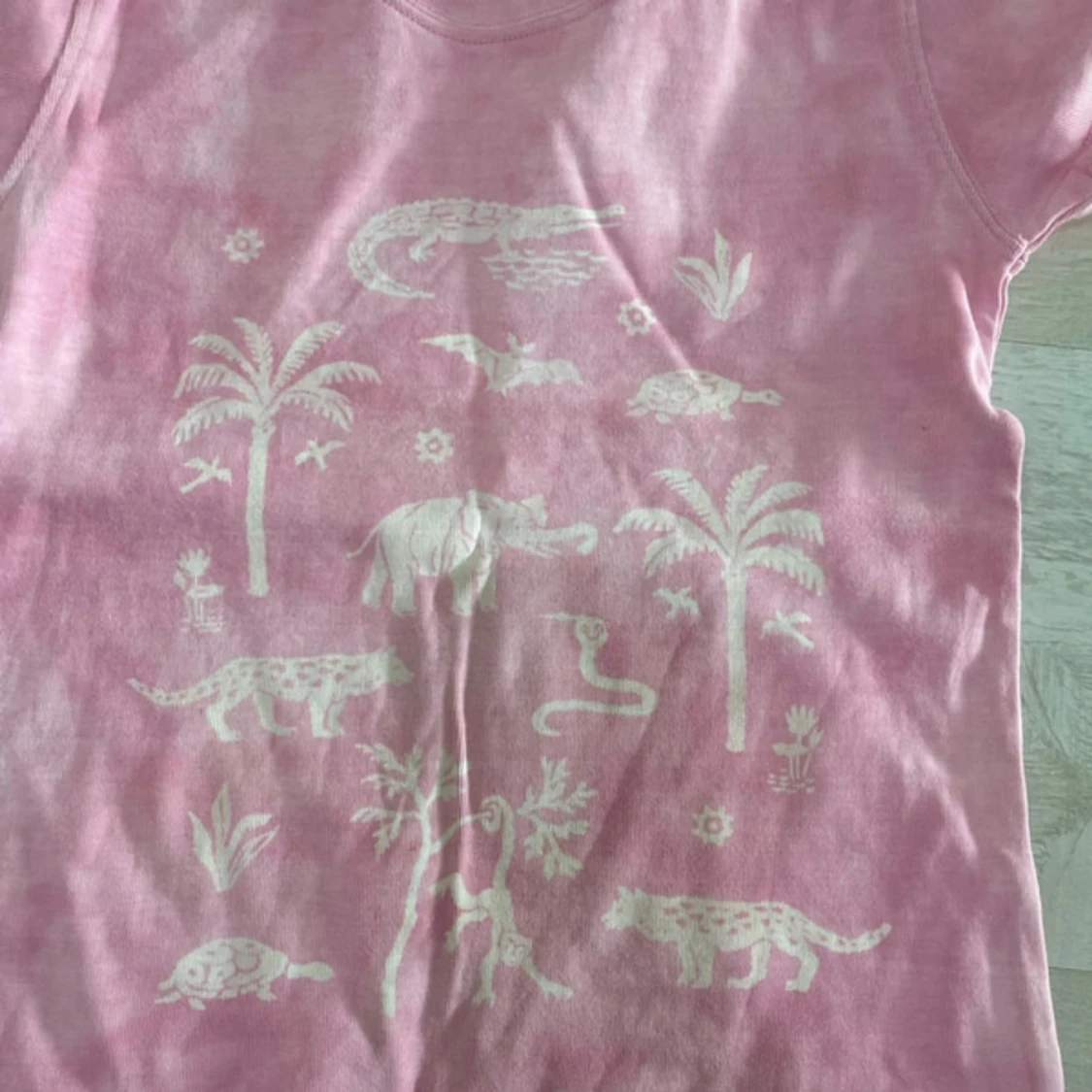 Söt rosa t-shirt från Indiska med korta ärmar och vitt tryck av djur, palmer och växter på framsidan.