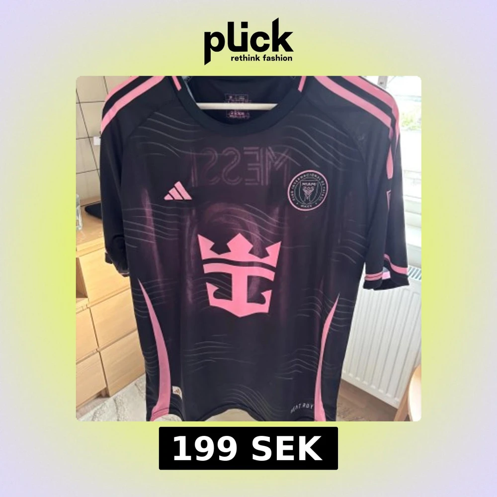 Snygg Inter Miami fotbollströja från Adidas med Messi 10-tryck på ryggen. Tröjan är svart med rosa detaljer, klubbmärke och stora grafiska tryck framtill. Tillverkad i lätt och ventilerande material, perfekt för fotbollsplanen eller att bära som supporter.