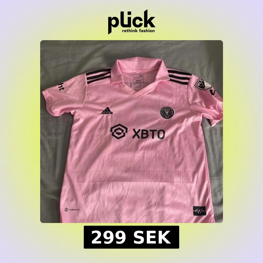 Säljer en rosa Inter Miami fotbollströja med Messi 10-tryck. Tröjan har svarta detaljer, klubbmärke på bröstet och flera sponsorer. Klassisk krage och tre svarta ränder på axlarna. Perfekt för fans av både laget och spelaren.