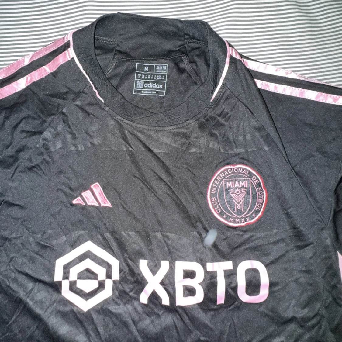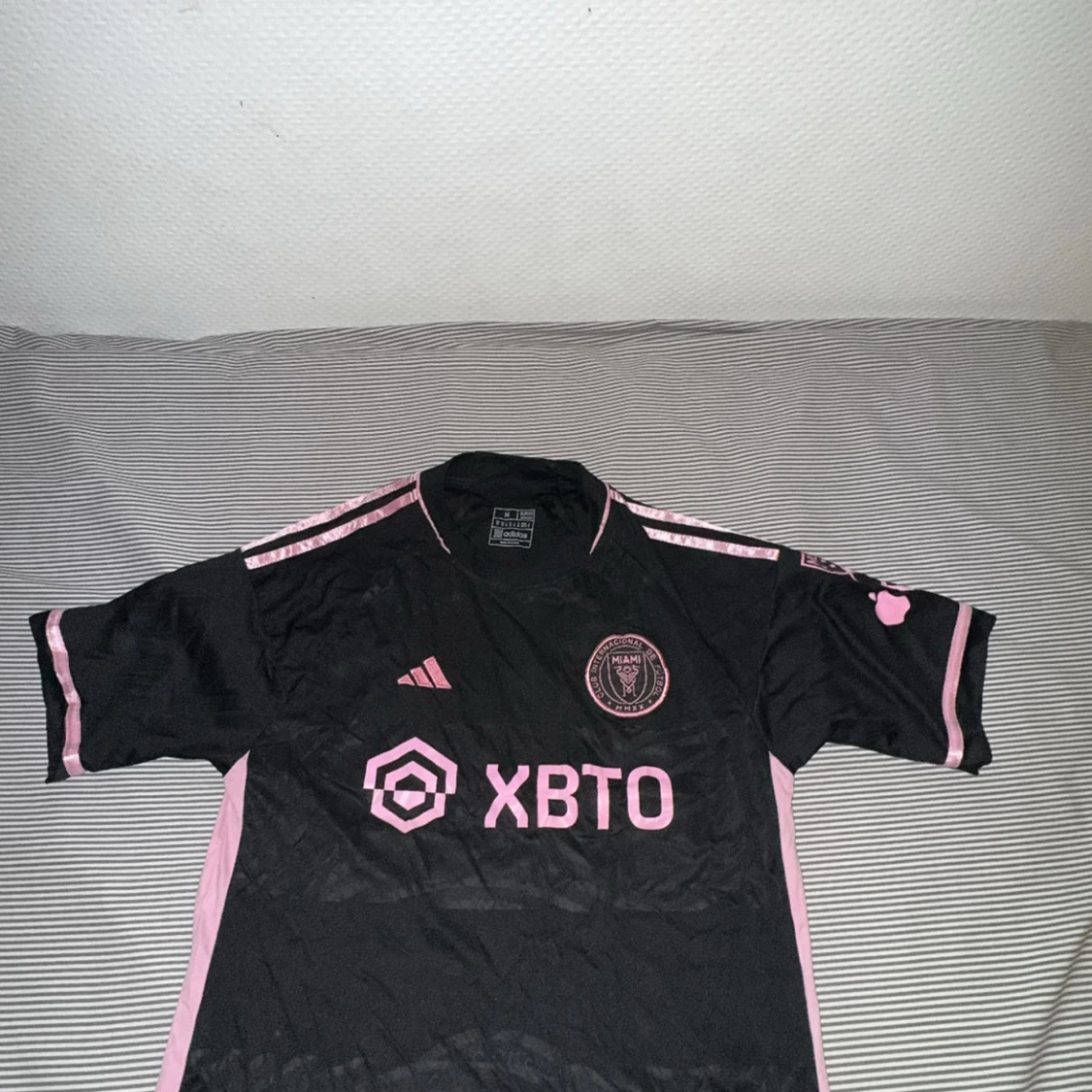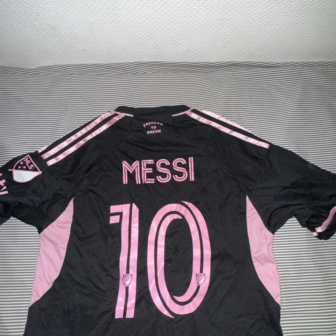 Snygg svart och rosa Inter Miami fotbollströja från Adidas med Messi 10 på ryggen. Tröjan har klubbmärke, sponsortryck och rosa detaljer längs axlarna. Tillverkad i lätt och ventilerande material, perfekt för fotboll eller att bära som supporter.