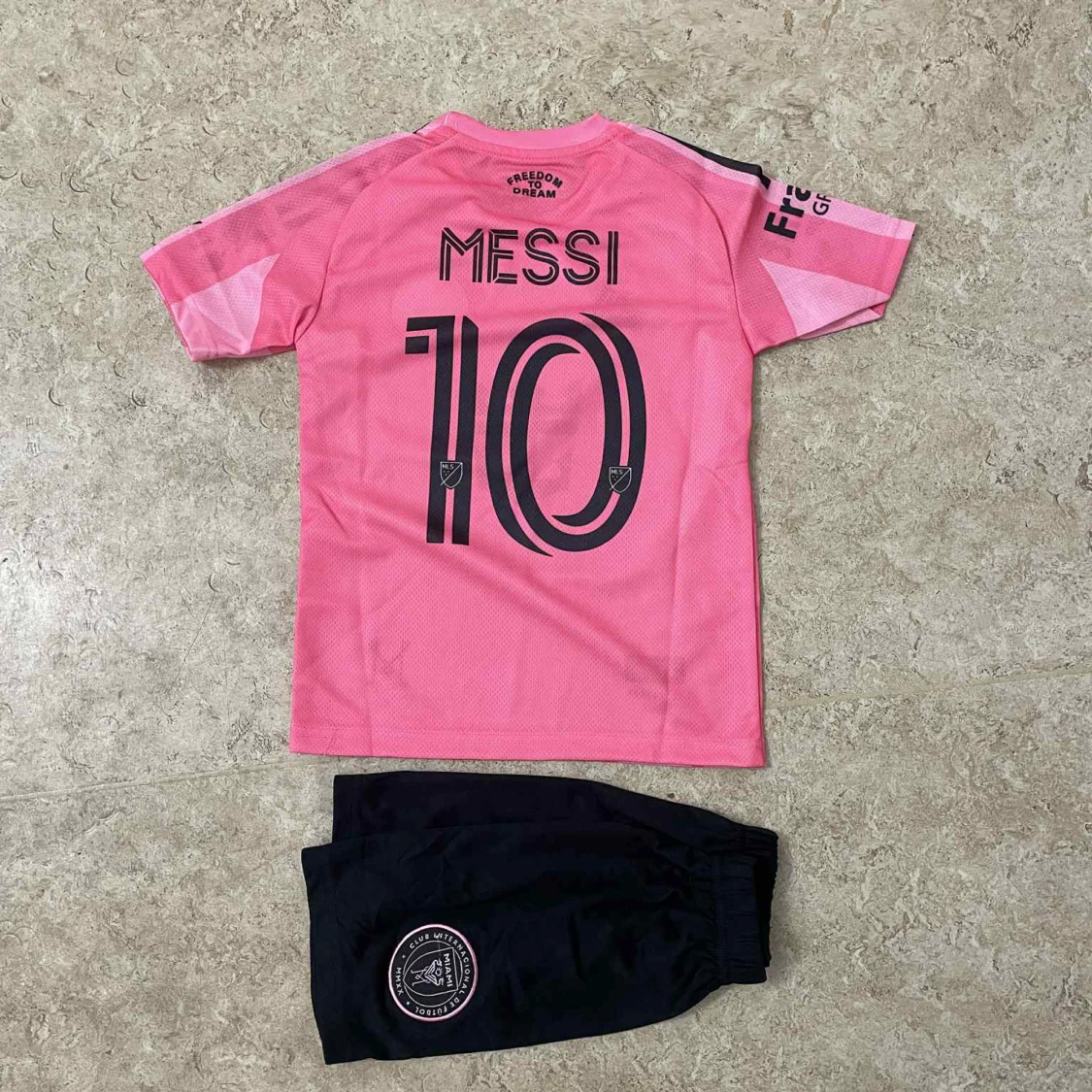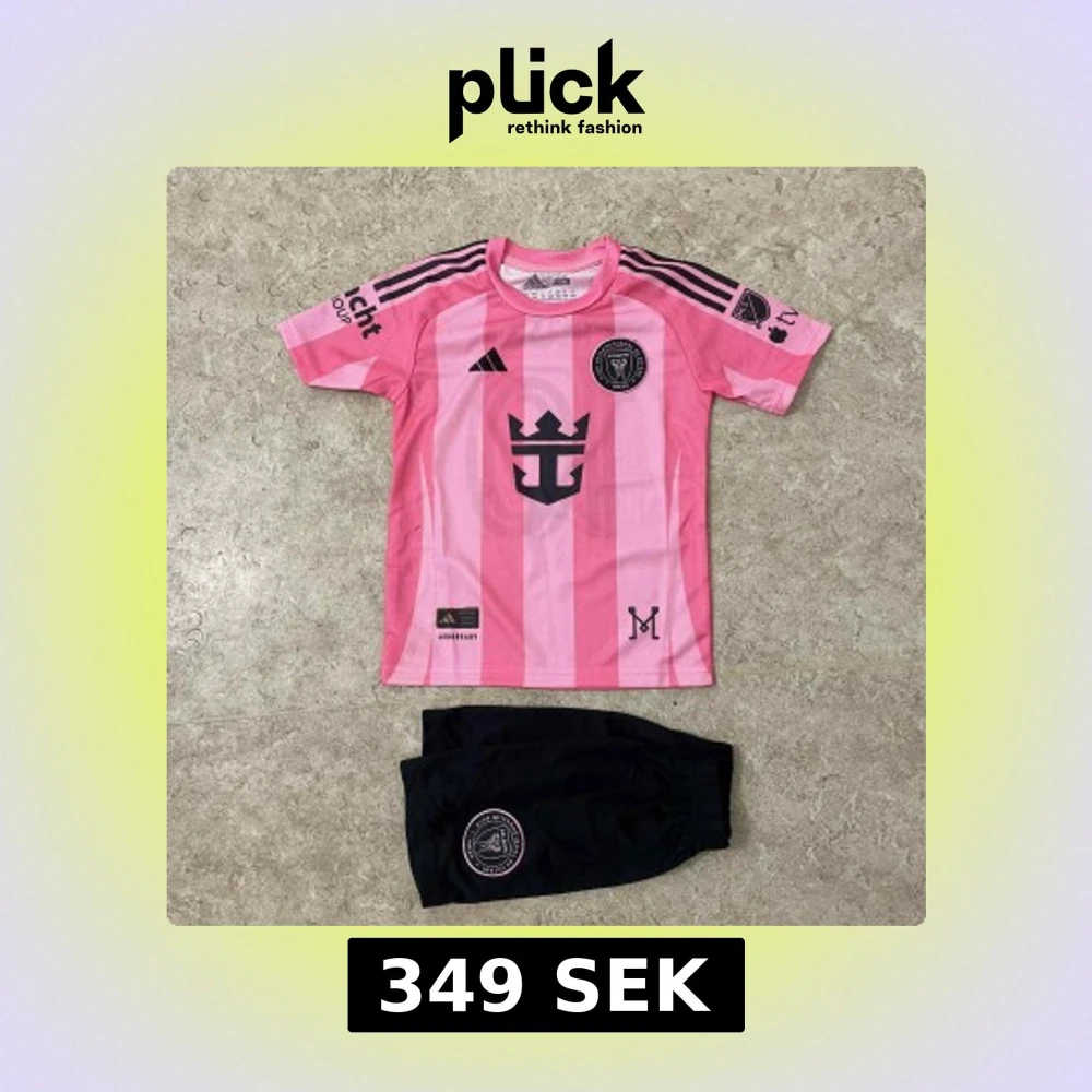 Säljer en rosa Inter Miami fotbollströja från Adidas med svarta detaljer, klubbmärke och Messi 10 på ryggen. Tröjan har korta ärmar, svarta ränder på axlarna och är tillverkad i ett lätt, ventilerande material. Matchande svarta shorts med klubbmärke ingår.