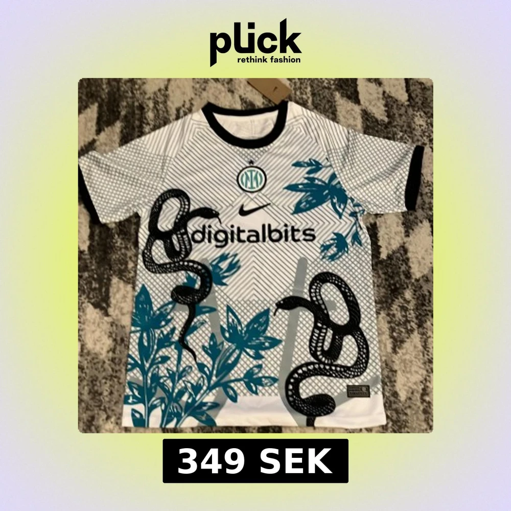 Unik Inter Milan fotbollströja från Nike med svart ormmönster och blåa blad på vit bas. Tröjan har svart krage och är kortärmad. Digitalbits-logga på bröstet och klubbmärke i blått och vitt. Perfekt för dig som vill sticka ut på planen.
