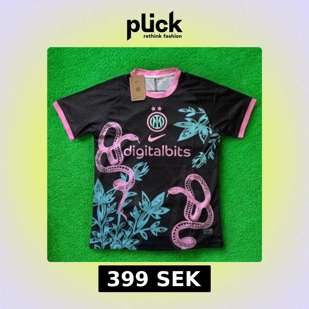 Snygg Inter Milan fotbollströja från Nike i svart med rosa detaljer och tryck. Framsidan har coola rosa ormar och blå blad, samt digitalbits-logga. Kortärmad med rosa muddar och krage. Materialet är lätt och andas, perfekt för match eller träning.