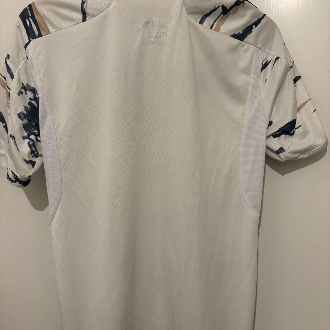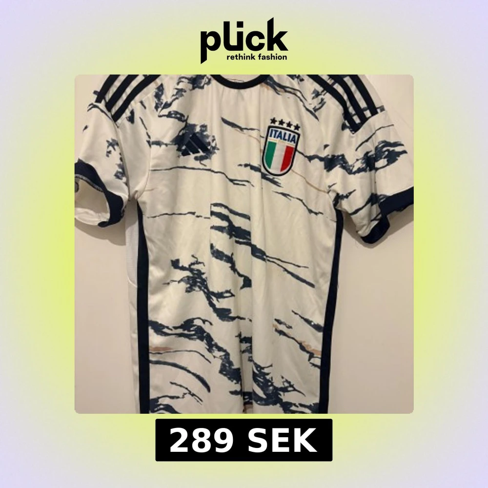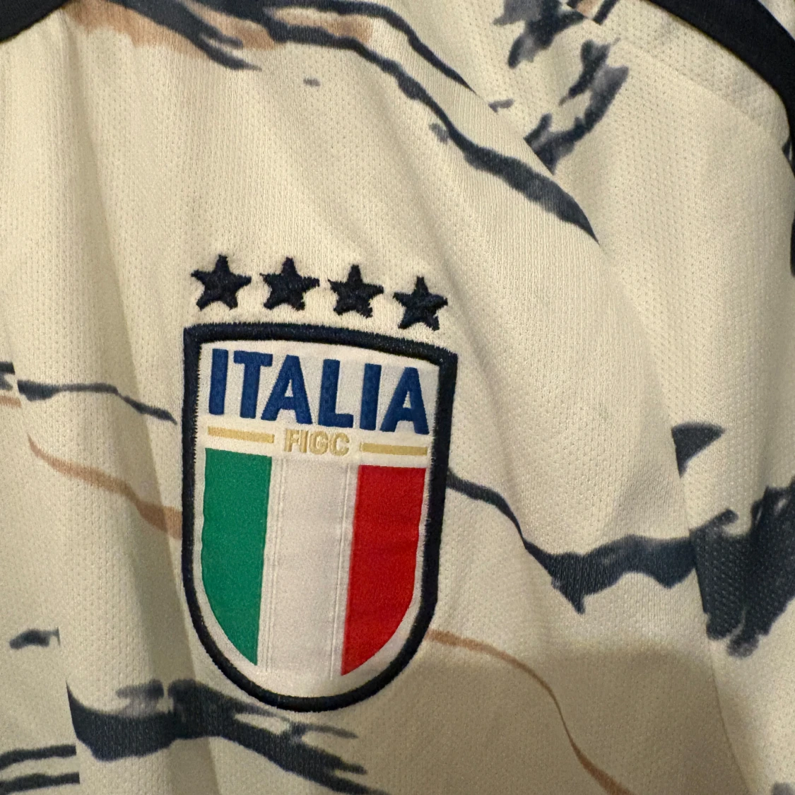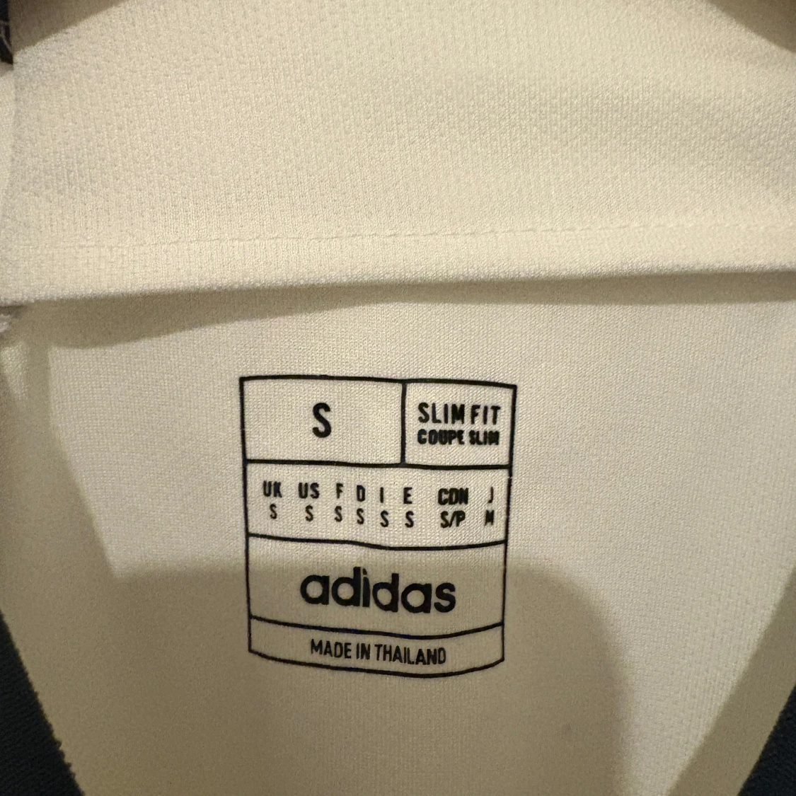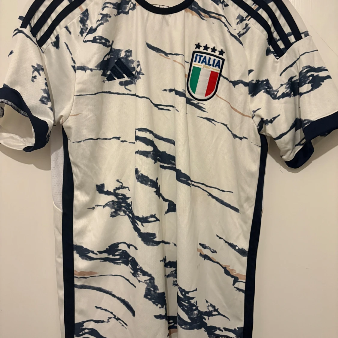 Italiens landslagströja från Adidas i slim fit, vit med marinblå och beige mönsterdetaljer. Korta ärmar, broderat landslagsmärke och klassiska Adidas-ränder på axlarna. Tillverkad i lätt och ventilerande material.