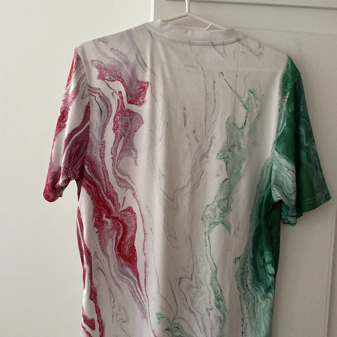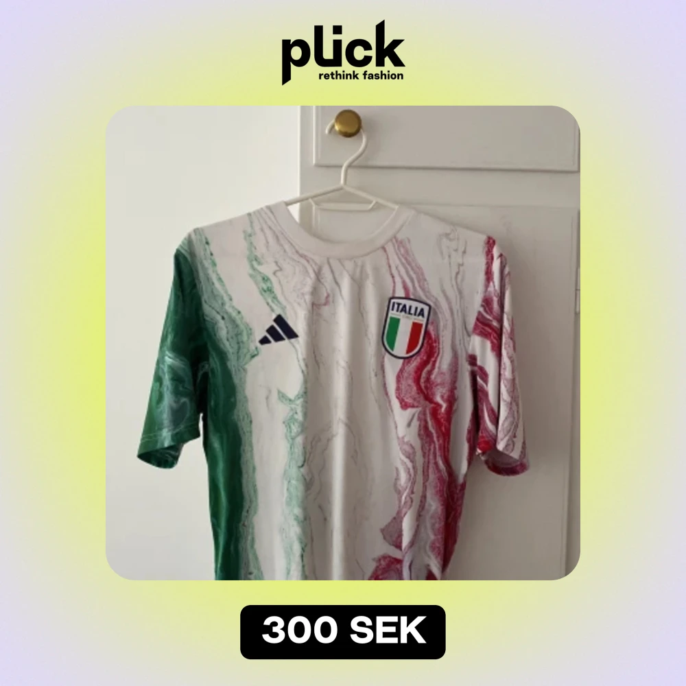 Säljer en snygg italiensk fotbollströja från Adidas i storlek M. Tröjan har ett coolt marmorliknande mönster i grönt, vitt och rött, vilket representerar Italiens flagga. Den är i nyskick och har korta ärmar. Perfekt för fotbollsfans eller som en stilren sporttröja!
