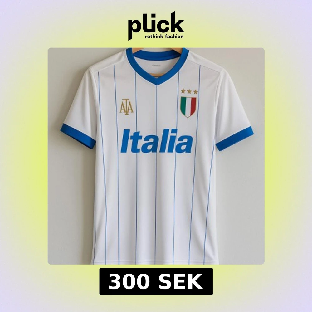 Snygg vit fotbollströja med tunna blå ränder, blå detaljer vid krage och ärmslut. Framsidan har 'Italia' i blått, guldiga detaljer och landslagsemblem med tre stjärnor. Baksidan har nummer 9 och namnet 'ITALIMIO'. Perfekt för dig som älskar italiensk fotboll.