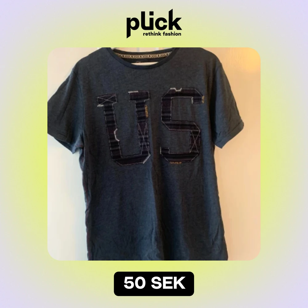 Säljer en snygg mörkblå t-shirt med stort 'US' tryck på framsidan. T-shirten är i bomull och har en normal passform. Perfekt för vardagsbruk eller en avslappnad dag ute. Den är kortärmad och i bra skick!