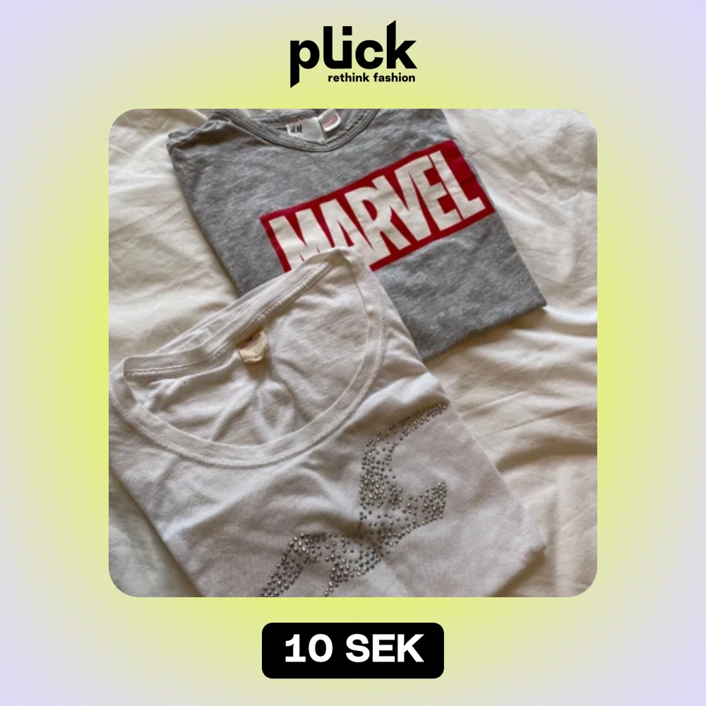 Säljer dessa två t-shirts då de inte kommer till användning längre. Den med tryck på är från HM (stl.S) och den med glitter är från Holister (stl. L). Tröjorna sitter inte tight och de har inga defekter. 10 kronor styck.