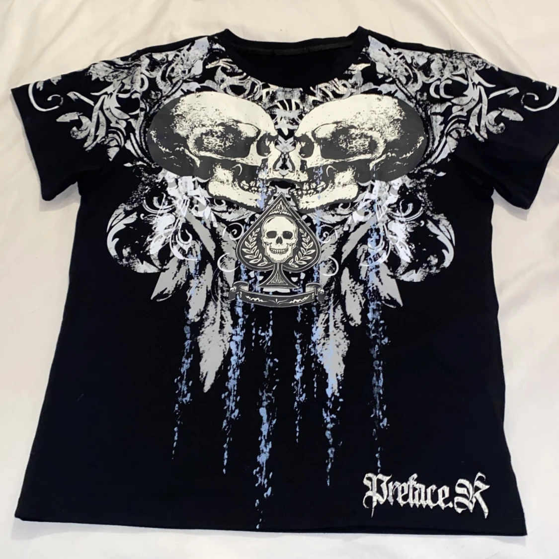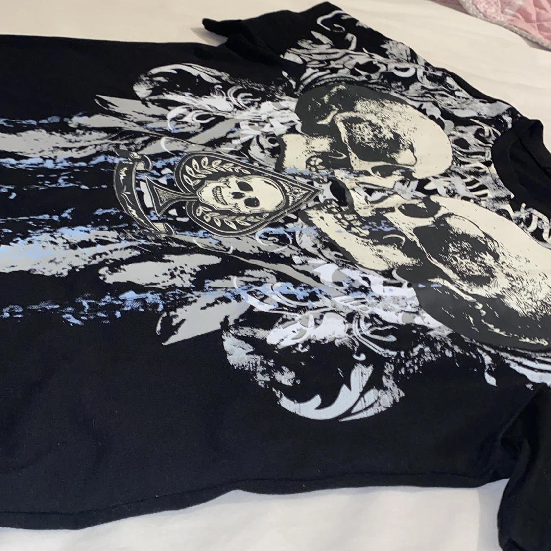 En svart t-shirt som är i nyskick den har död skallar på, den har används en gång och den är Jätte skön att ha på sig och bra material.