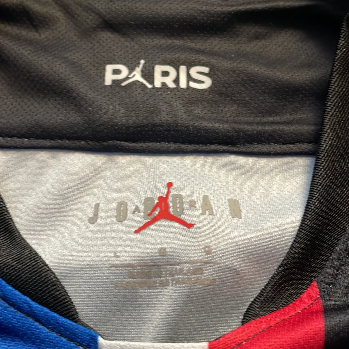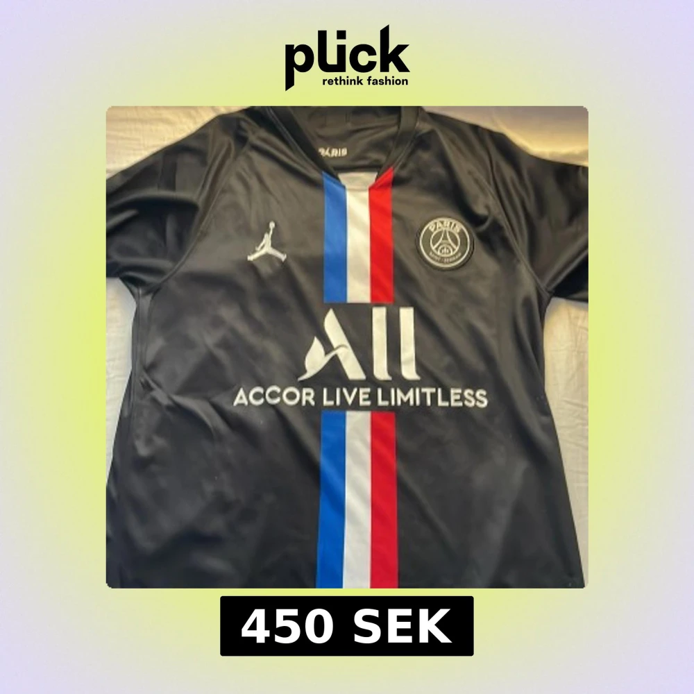 Snygg svart PSG-tröja med Mbappé 7 på ryggen. Framsidan har Paris Saint-Germain-logga och Jordan-märke. Vertikala ränder i blått och rött ger en cool kontrast. Perfekt för fans av både PSG och Mbappé!