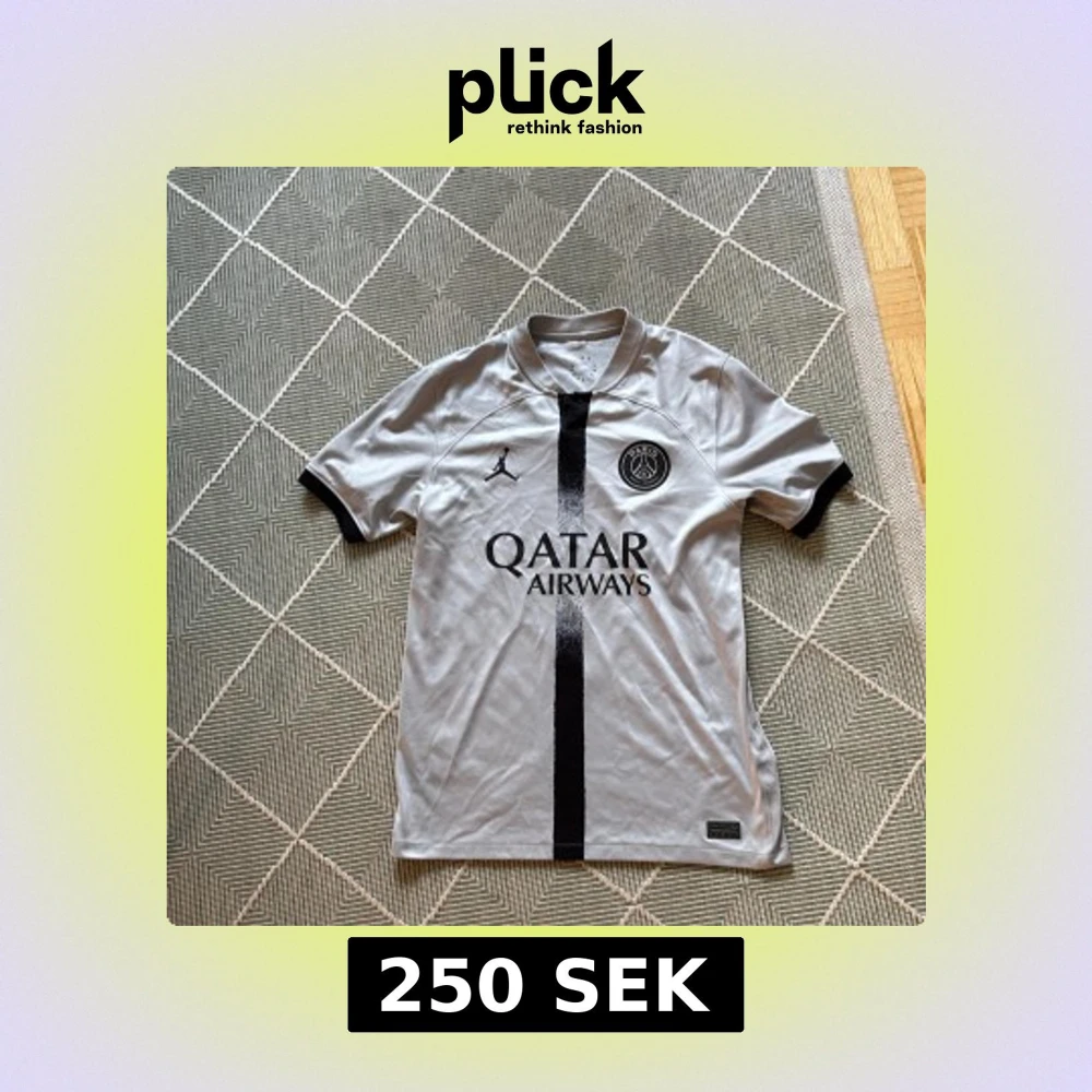 Snygg PSG fotbollströja i grått med svart vertikal rand och svarta detaljer. Jordan-logga på bröstet och Paris Saint-Germain-emblem. Tillverkad i lätt och ventilerande material, perfekt för träning eller match. Qatar Airways tryck på framsidan.