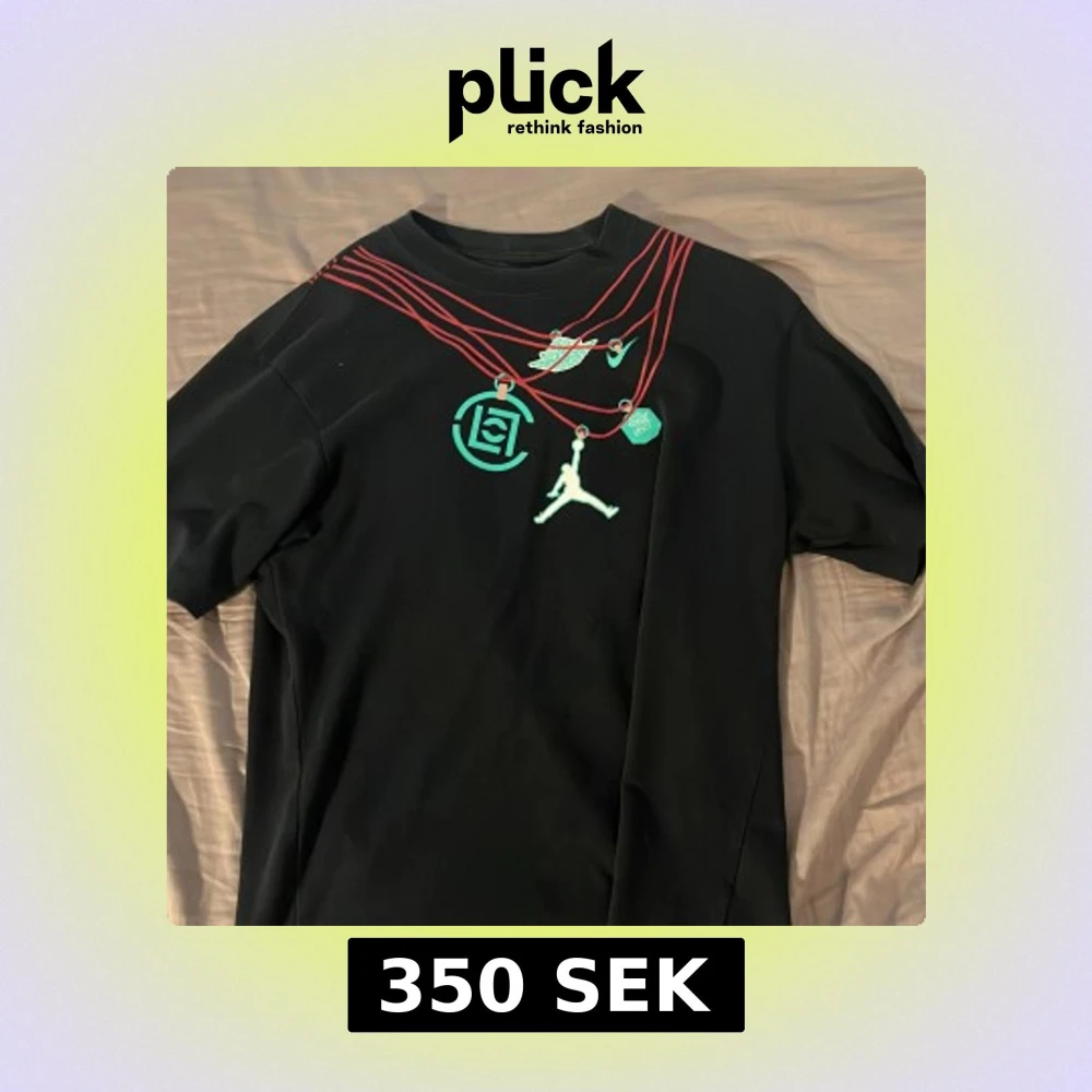 Svart t-shirt från Jordan x Nike med coola grafiska tryck i turkos och röd på både fram- och baksida. Trycken föreställer kedjor, Jumpman-loggan, Nike swoosh och texten 'Jordan'. Skön passform och tillverkad i mjuk bomull. Perfekt för dig som gillar streetwear och sportig stil.