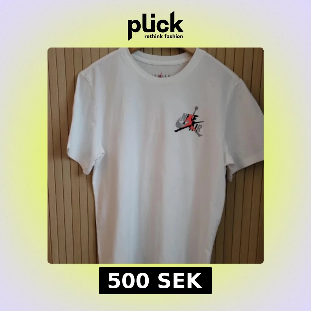 Snygg vit t-shirt från Nike Air Jordan med ikoniskt Jumpman-tryck i svart, grått och rött på bröstet och stort tryck på ryggen. Klassisk passform och rund hals. Perfekt för dig som gillar streetwear och sportig stil.
