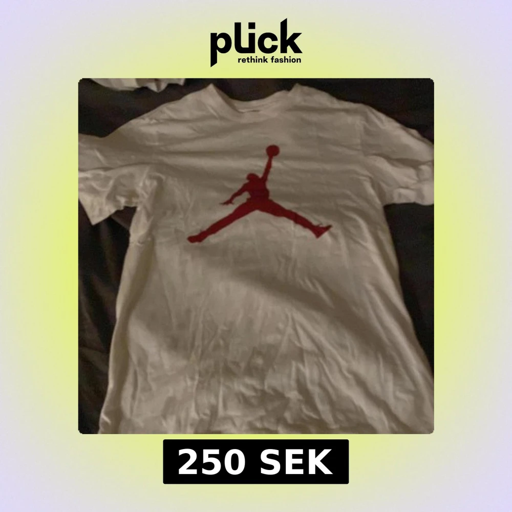Säljer en vit t-shirt från Jordan med det ikoniska röda logotyptrycket på framsidan. Perfekt för sportiga tillfällen eller som en stilren vardagslook. T-shirten är kortärmad och gjord i mjukt bomullsmaterial.