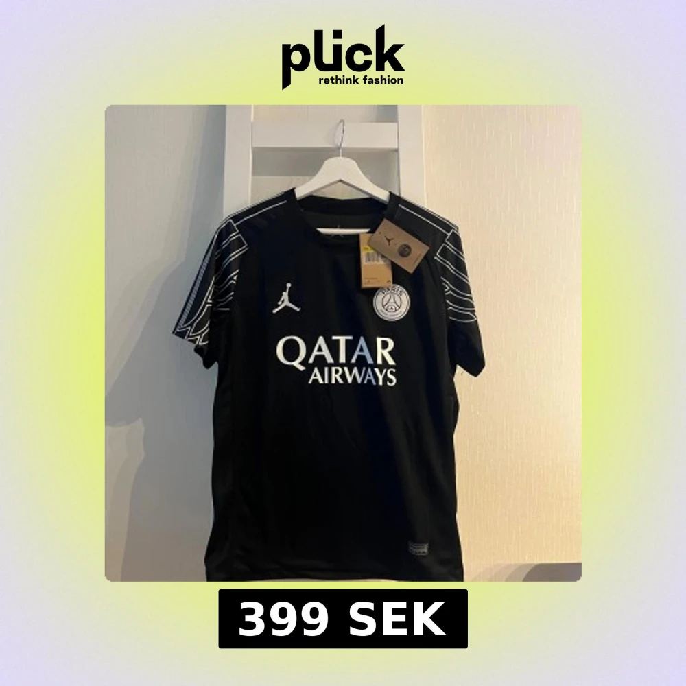 Snygg svart PSG fotbollströja från Jordan med vita detaljer och loggor. Tröjan har korta ärmar med unika vita linjemönster på axlarna och är tillverkad i ett lätt och ventilerande material. Perfekt för dig som vill sticka ut på planen eller på läktaren.