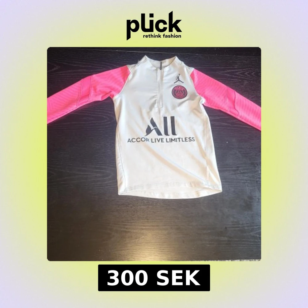 Snygg PSG x Jordan långärmad fotbollströja i vitt med rosa ärmar och svart tryck framtill. Tröjan har halv dragkedja, Paris Saint-Germain-logga på bröstet och är tillverkad i ett lätt och sportigt material som andas. Perfekt för träning eller match.