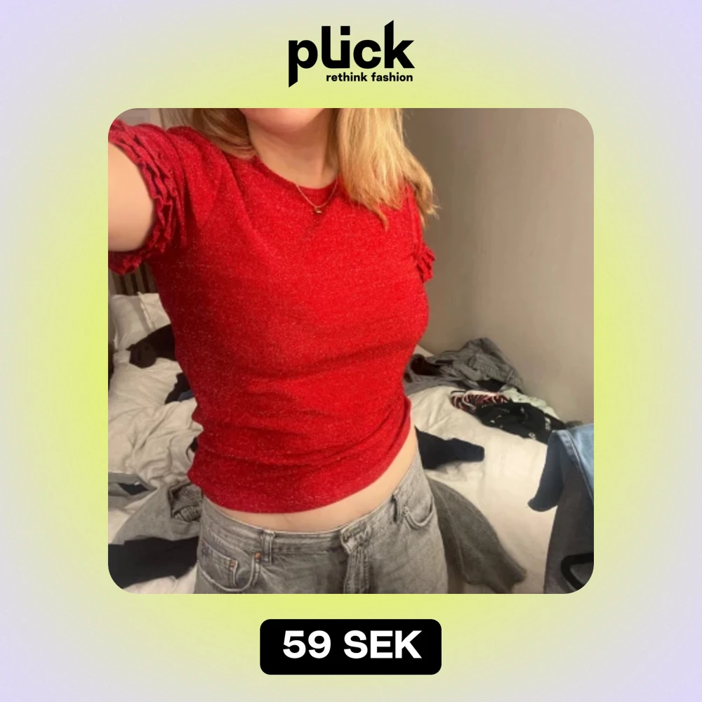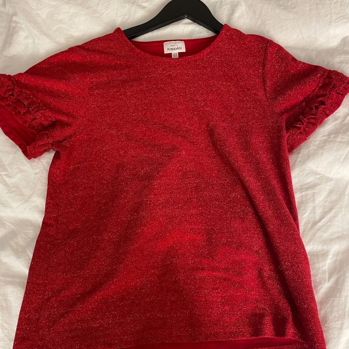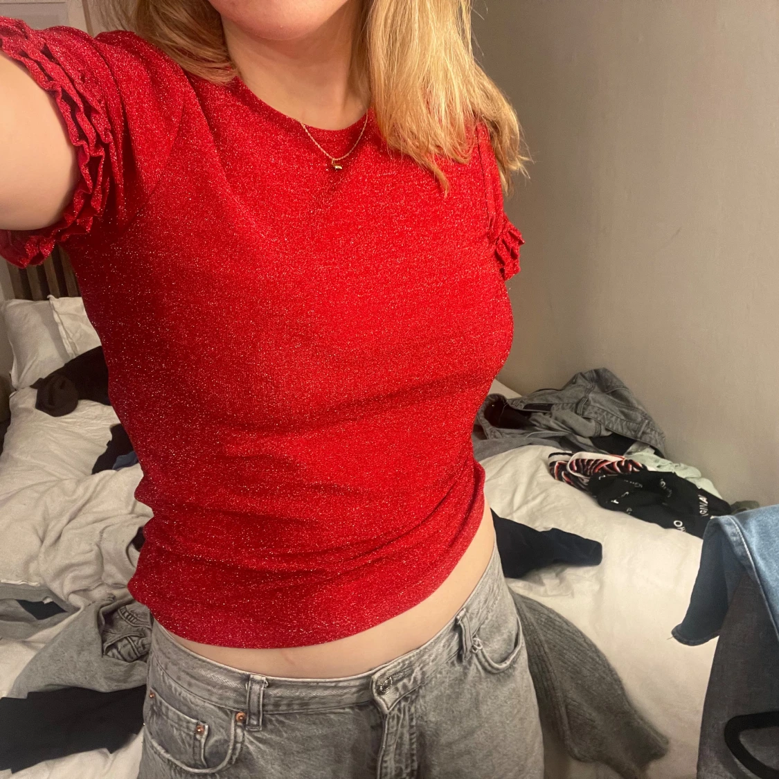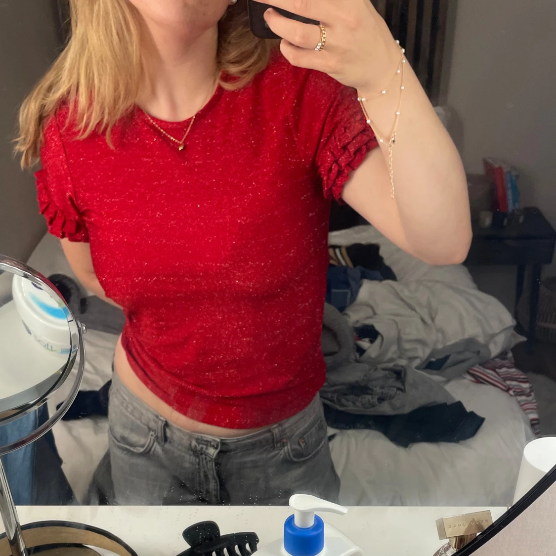 Glittrig gullig och julig T-shirt med volanger på ärmarna. Perfekt till julafton eller en julfest. Säljer då den inte passar.💗❤️