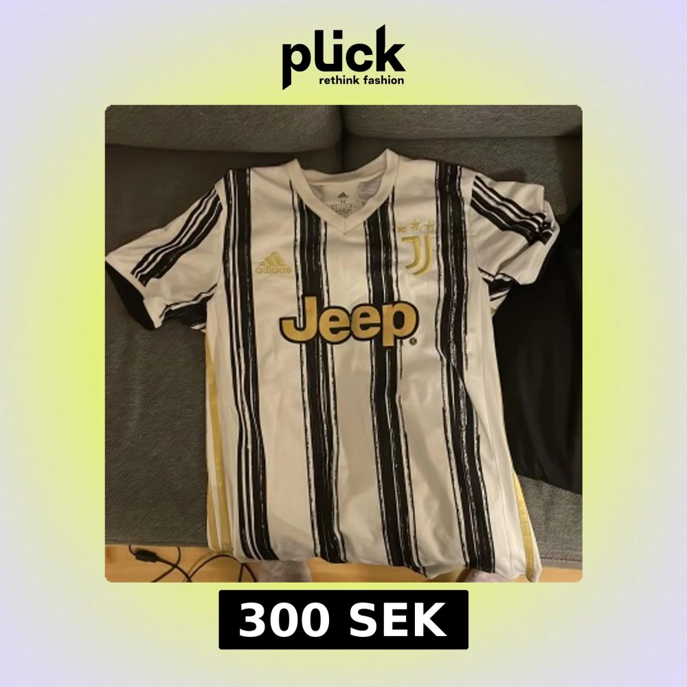 Juventus matchtröja från Adidas i storlek M. Tröjan är vit med svarta ränder och har guldiga detaljer som Jeep-loggan, Adidas-märket och Juventus-emblemet med tre stjärnor. Tillverkad i lätt och ventilerande polyester, perfekt för fotboll eller häng.
