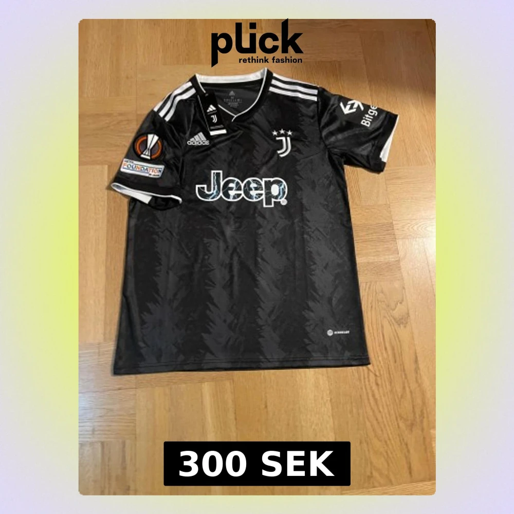 Juventus officiella svarta matchtröja från Adidas med vita detaljer och tryck. Tröjan har korta ärmar, UEFA Foundation-märke på ärmen och Jeep-logga på bröstet. Tillverkad i lätt och ventilerande polyester med subtilt mönster i tyget.