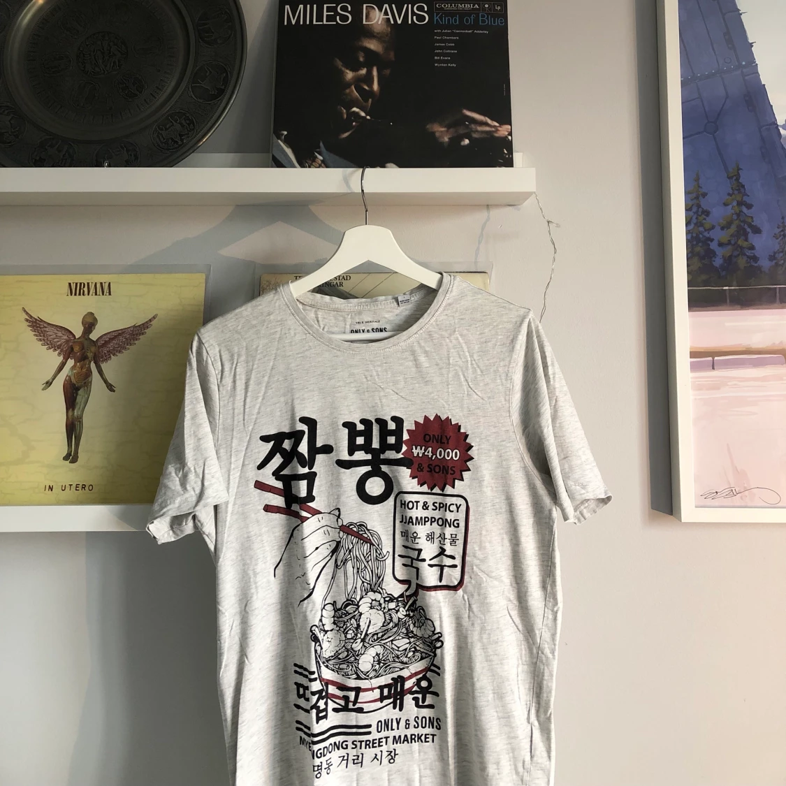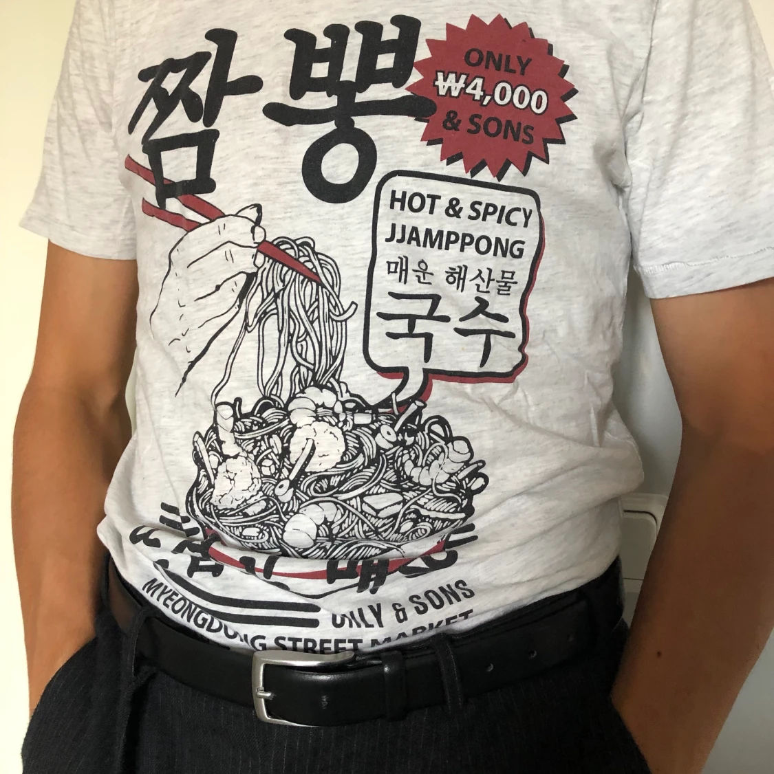 T-Shirt med coolt tryck på nudlar och lite annat! Storleken är Large men den känns mer som en Medium.
