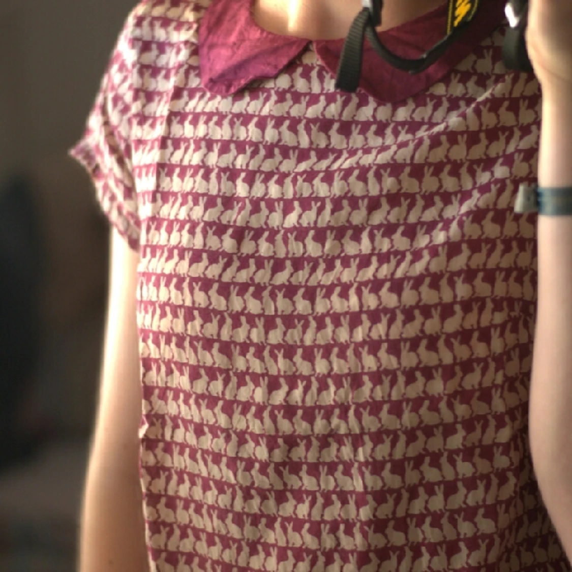 Jättesöt topp med motiv av små kaniner! Perfekt till djurälskaren!🐰 Rundad krage i halsringning och dragkedja i ryggen. Strl 42 på lappen men är väldigt liten i storlek! Passar mig som har storlek 34 normalt.