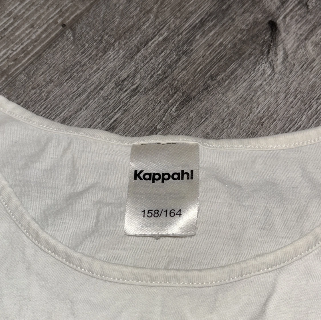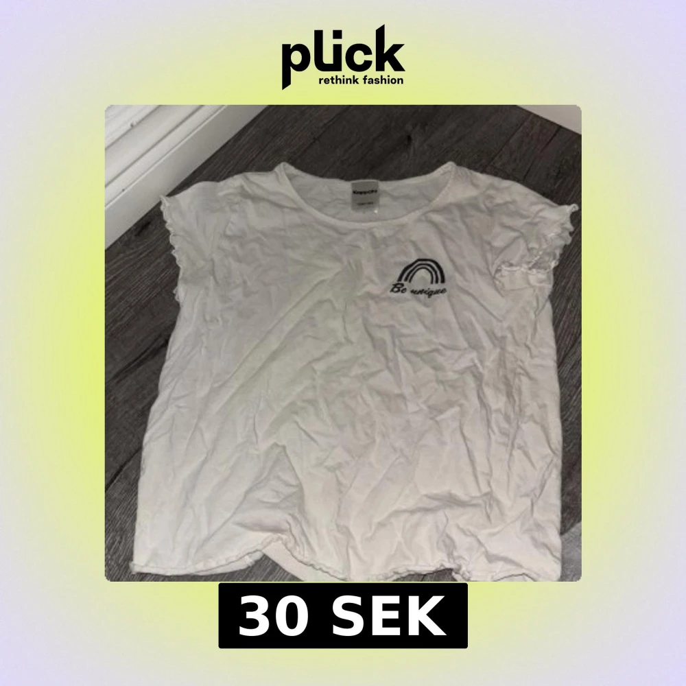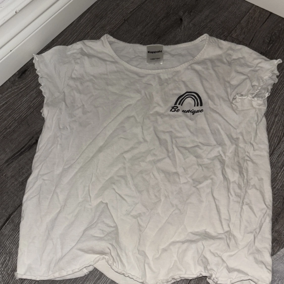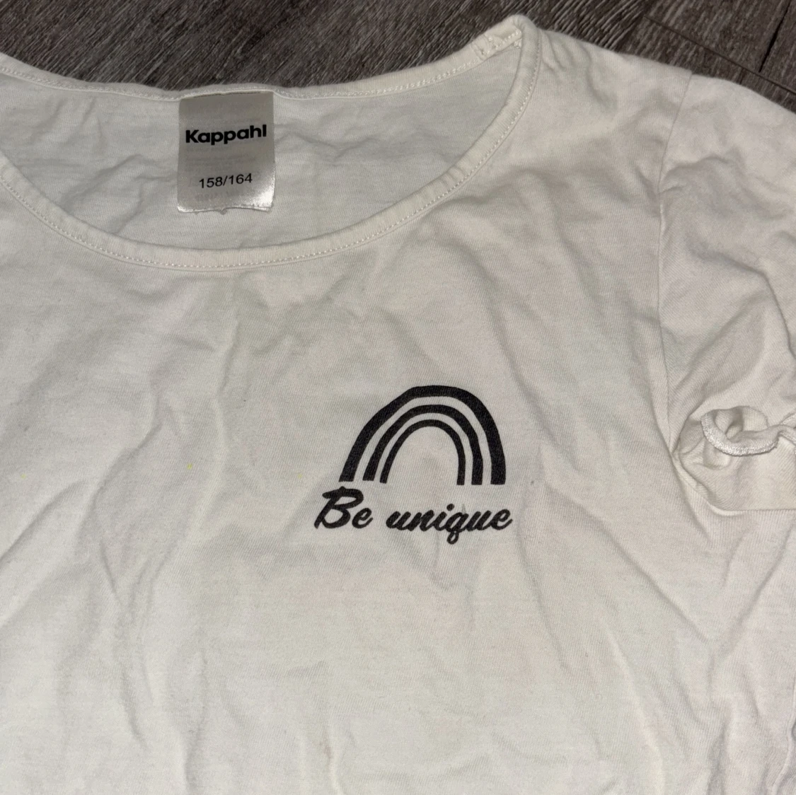 Vit t-shirt från Kappahl med svart tryck av en regnbåge och texten 'Be unique' på bröstet. T-shirten har korta ärmar med lätt volangkant och är gjord i mjuk bomull. Perfekt och sova i
