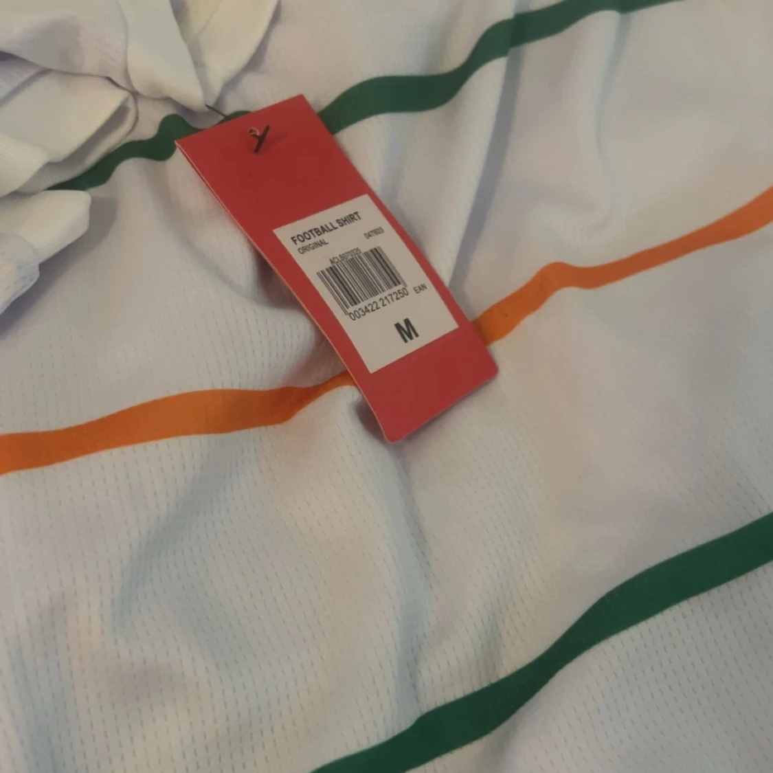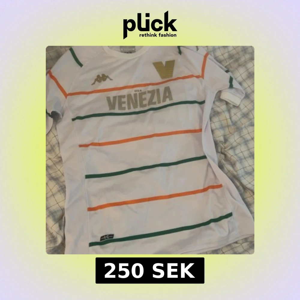 Snygg vit fotbollströja från Venezia FC med gröna och orange horisontella ränder, guldiga detaljer och Kappa-logga på bröstet. Tillverkad i lätt och ventilerande material, perfekt för match eller träning. Klassisk passform och korta ärmar.