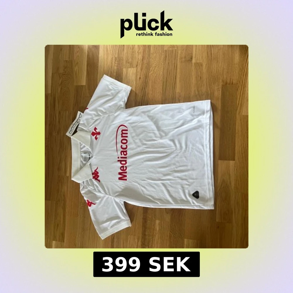 Snygg vit Fiorentina fotbollströja från Kappa i storlek S. Tröjan har röd Mediacom-logga på bröstet, röda Kappa-loggor på axlarna och texten 'Fiorentina' i nacken. Tillverkad i lätt och ventilerande polyester, perfekt för match eller träning.