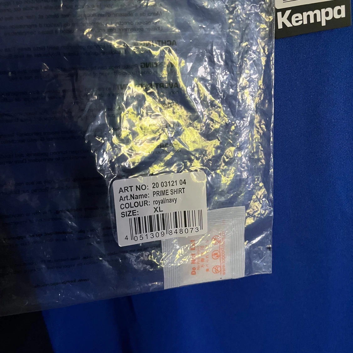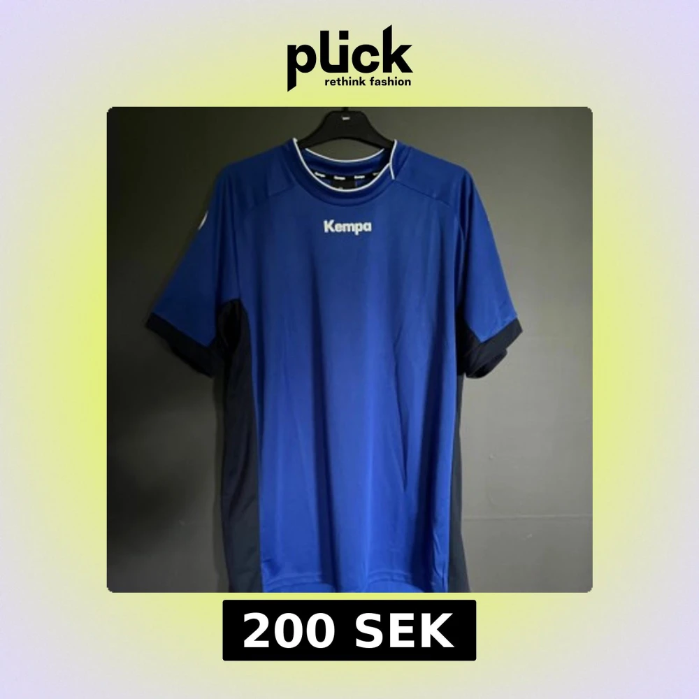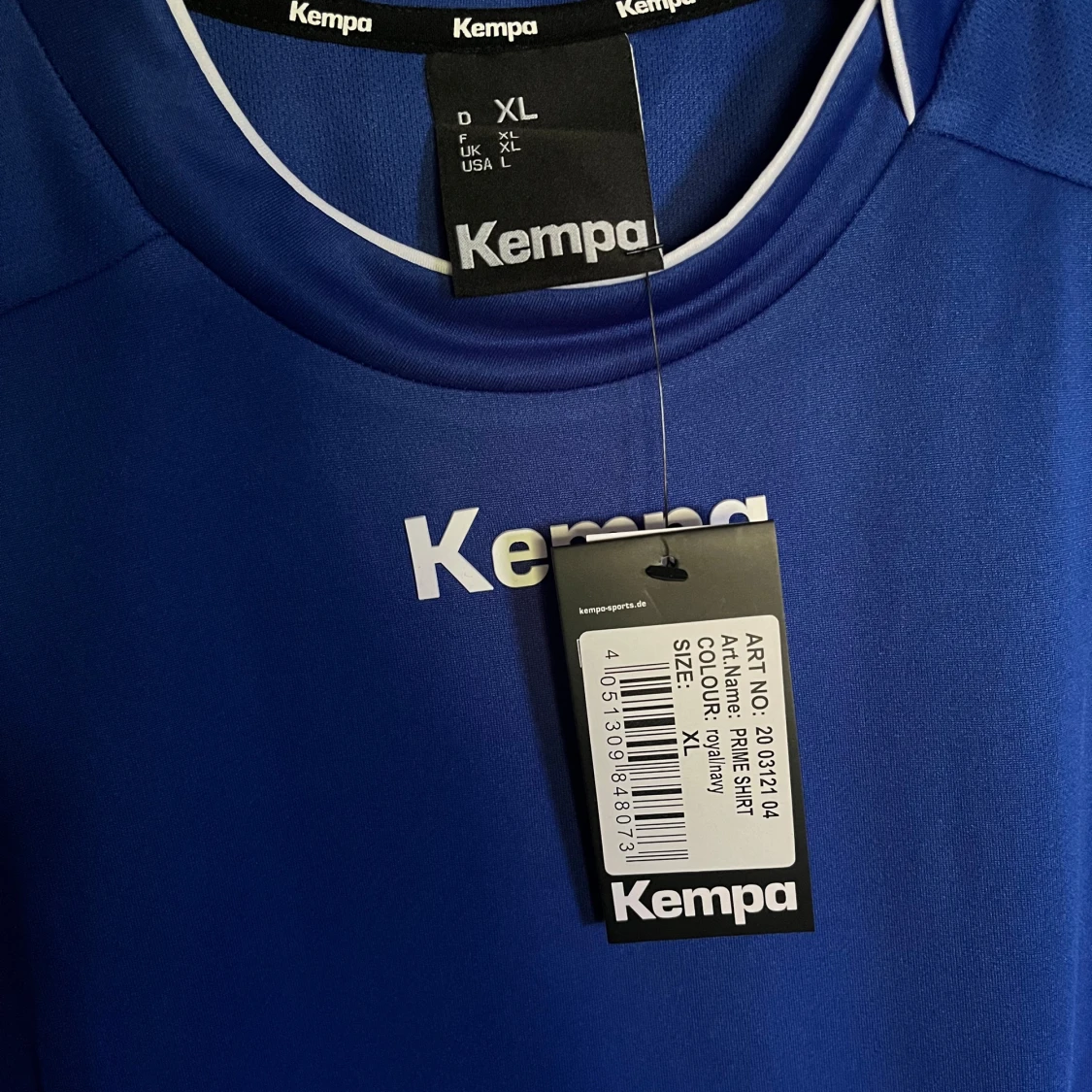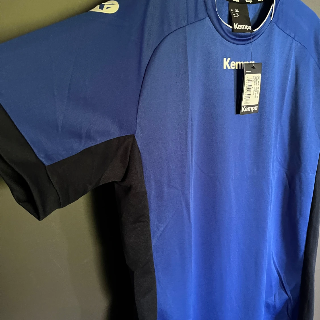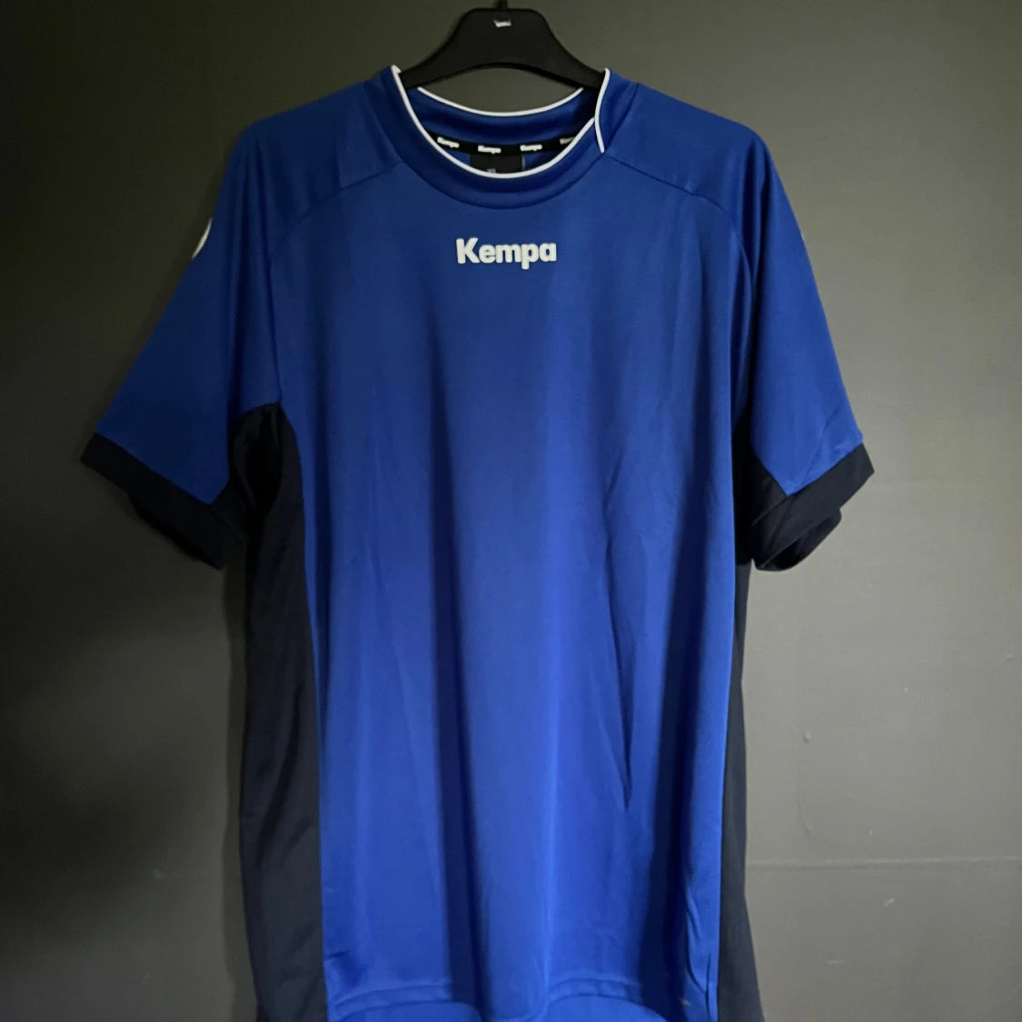 Snygg blå tröja från Kempa i storlek XL. Tröjan har svarta detaljer på sidorna och ärmarna, rund halsringning med vit kant och tryckt Kempa-logga på bröstet. Tillverkad i lätt och funktionellt material som passar perfekt till träning eller match. Tröjan är oanvänd då jag beställde fel storlek