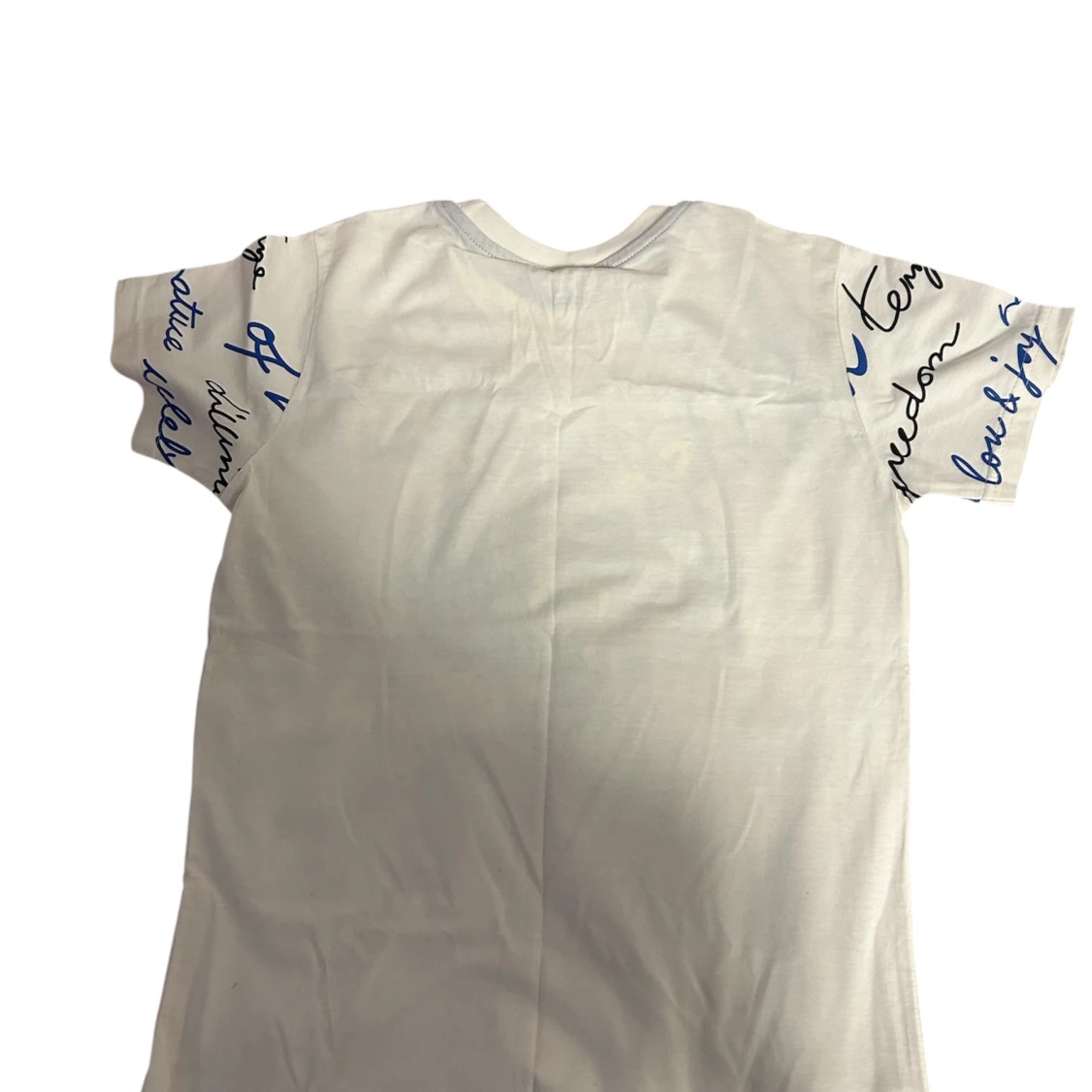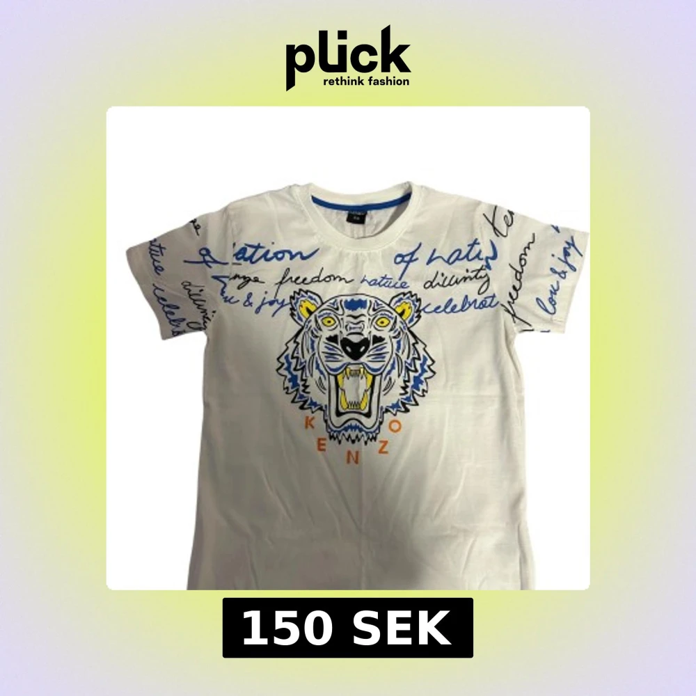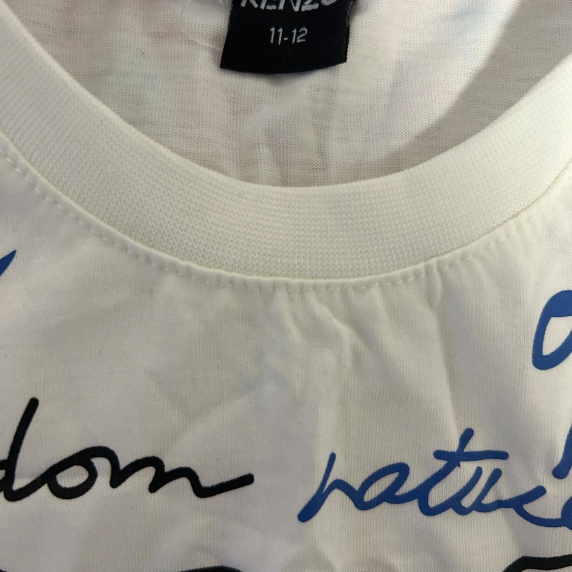 Snygg vit t-shirt från Kenzo med ikoniskt tigertryck framtill och blå samt svarta handskrivna texter över hela framsidan och ärmarna. Klassisk passform och rund halsringning. Perfekt för dig som vill sticka ut med en cool streetstyle-look. Till pojkar 11-12 år