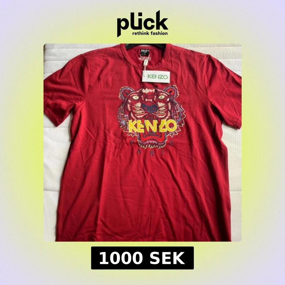 Säljer en röd t-shirt från Kenzo med ett stort, färgglatt tigerbroderi på framsidan. T-shirten har korta ärmar och är tillverkad i bomull. Perfekt för dig som vill sticka ut med en djärv design!