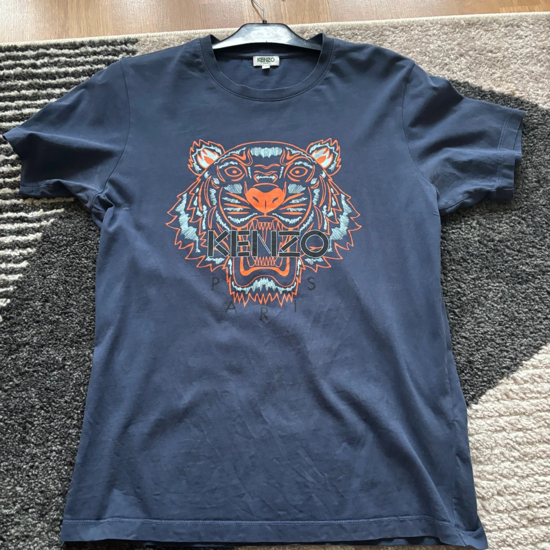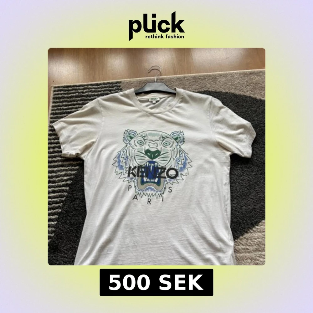 Två snygga Kenzo t-shirts med ikoniskt tigertryck på bröstet. Ena är vit med grönt och blått tryck, andra är marinblå med orange och blått tryck. Båda har rund hals och korta ärmar, tillverkade i mjuk bomull. Perfekt för dig som gillar statement-plagg och streetstyle.