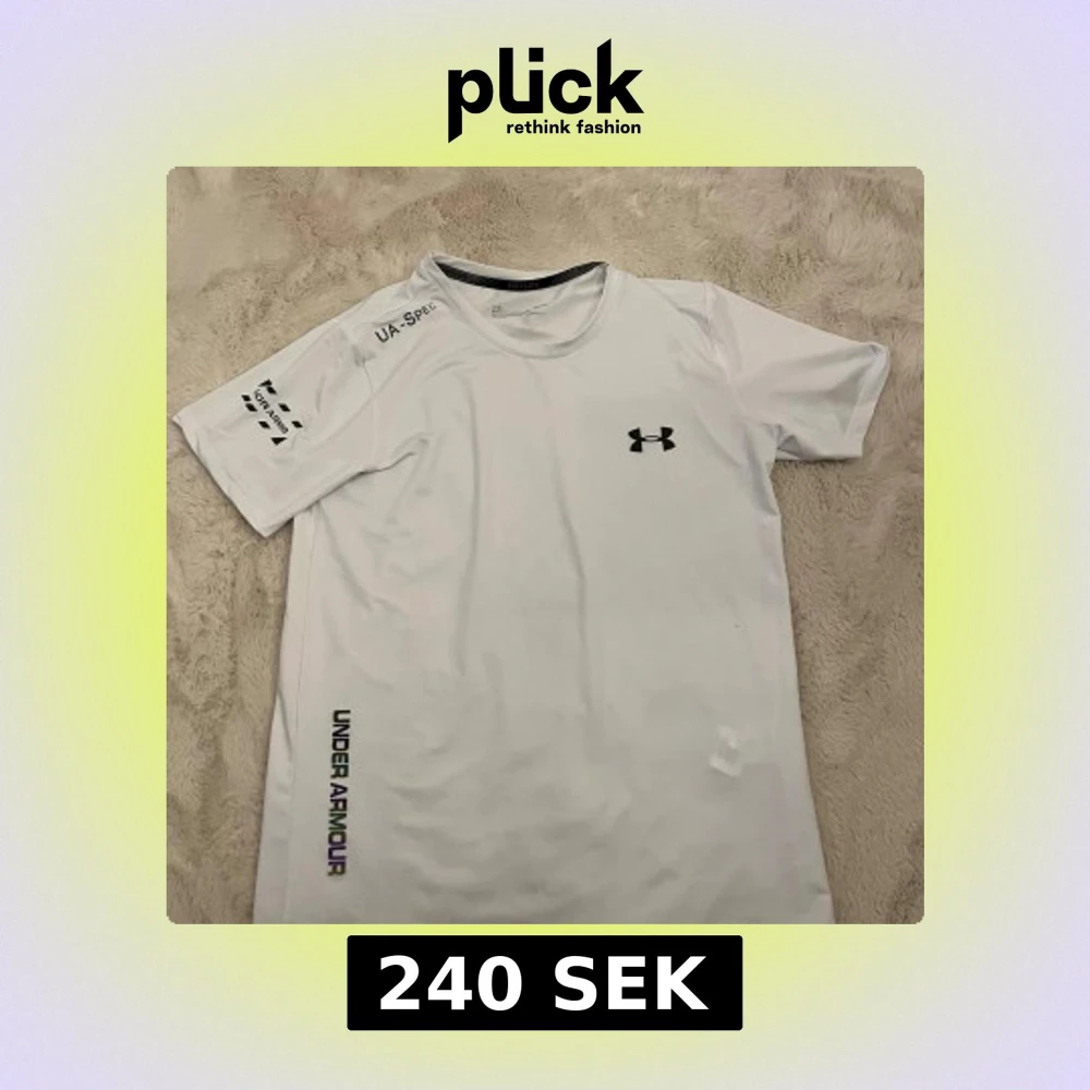 Snygg vit t-shirt från Under Armour med svart logga på bröstet och tryck på ärmen samt längs sidan. Tillverkad i mjuk och lätt polyester, perfekt för träning. Klassisk passform med korta ärmar och rund halsringning. Den är reflektiv