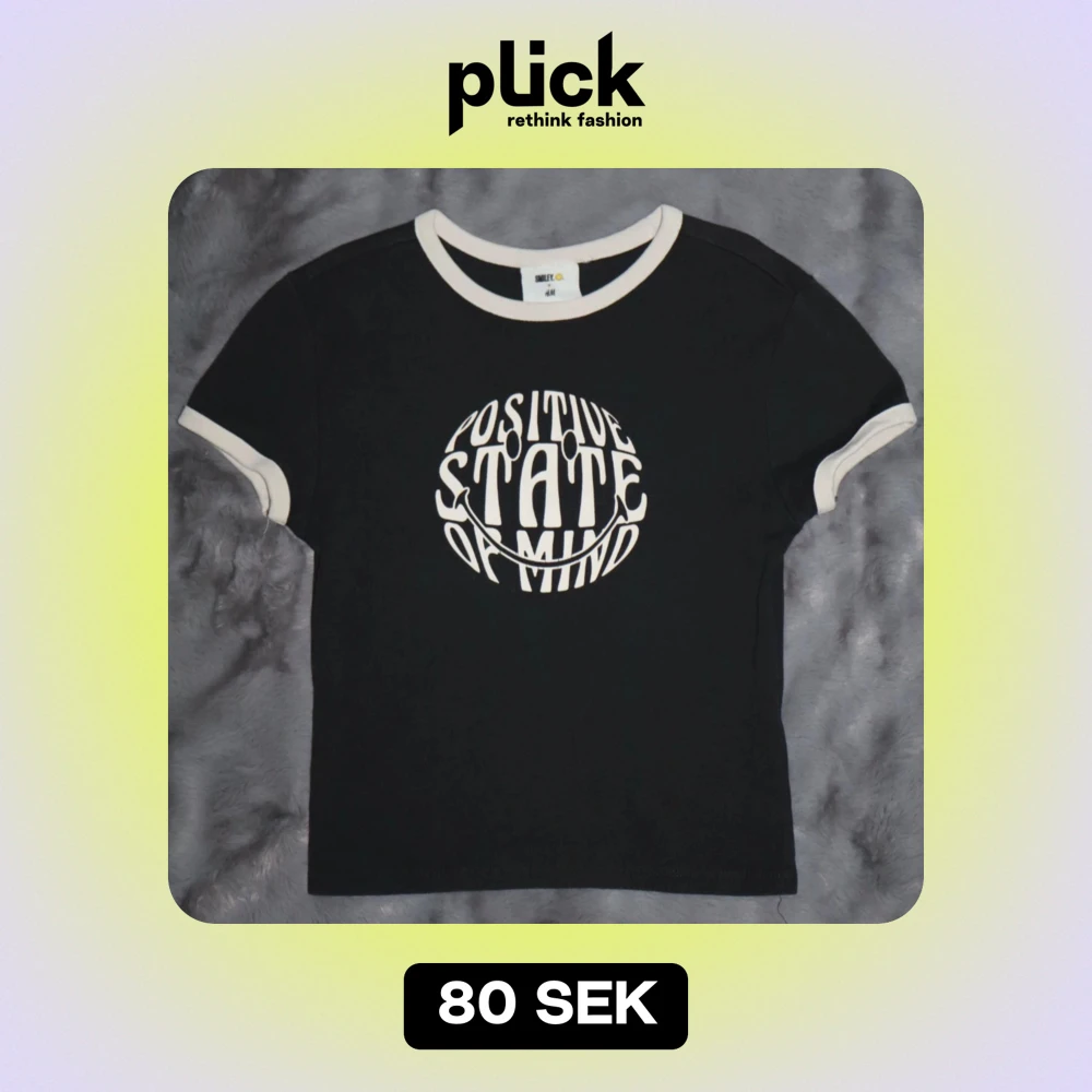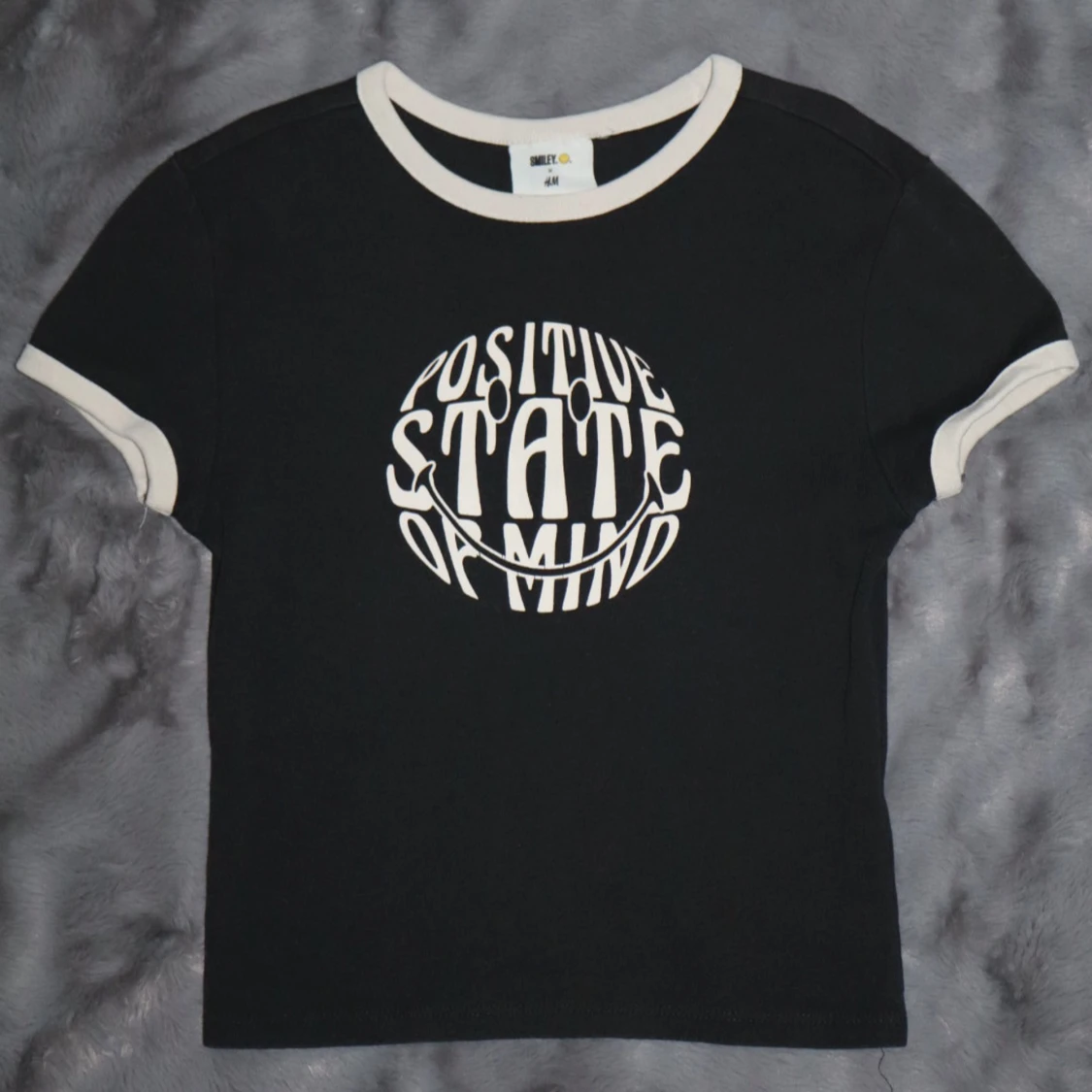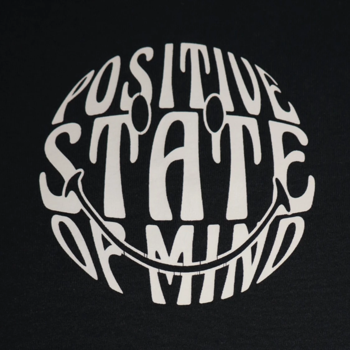 Mörkgrå t-shirt. Har ett tryck med texten 'Positive State of Mind' i vitt. T-shirten är kortärmad och har vita kanter vid ärmar och hals. Den har en aningen tajtare passform och kortare modell.