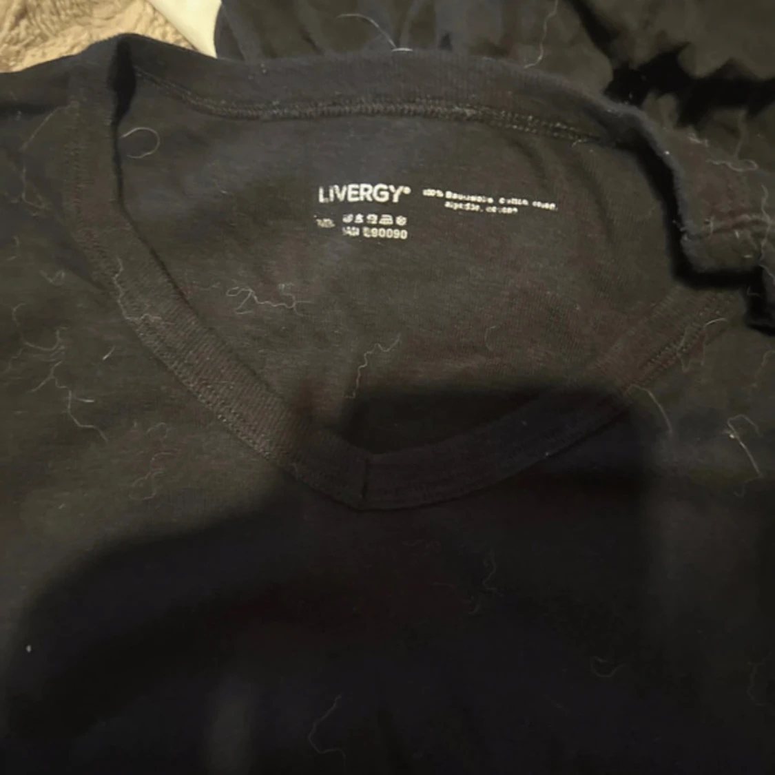 Svart t-shirt från Livergy i storlek L med v-ringad hals. Klassisk och enkel design med korta ärmar, tillverkad i mjuk bomull som är skön mot huden. Perfekt för dig som gillar basic och stilrena plagg.