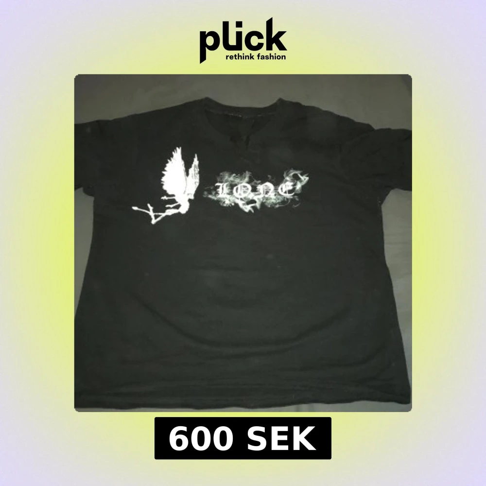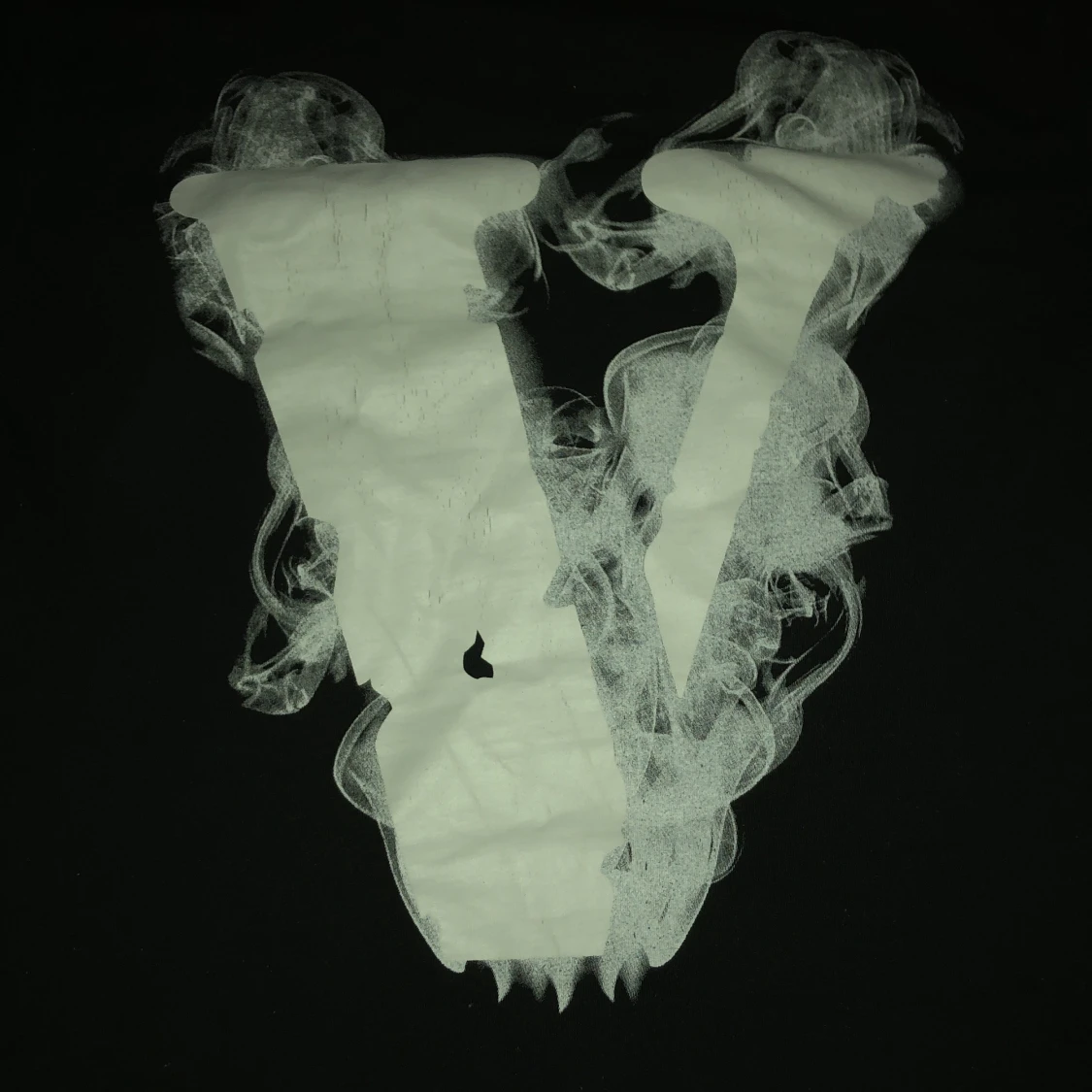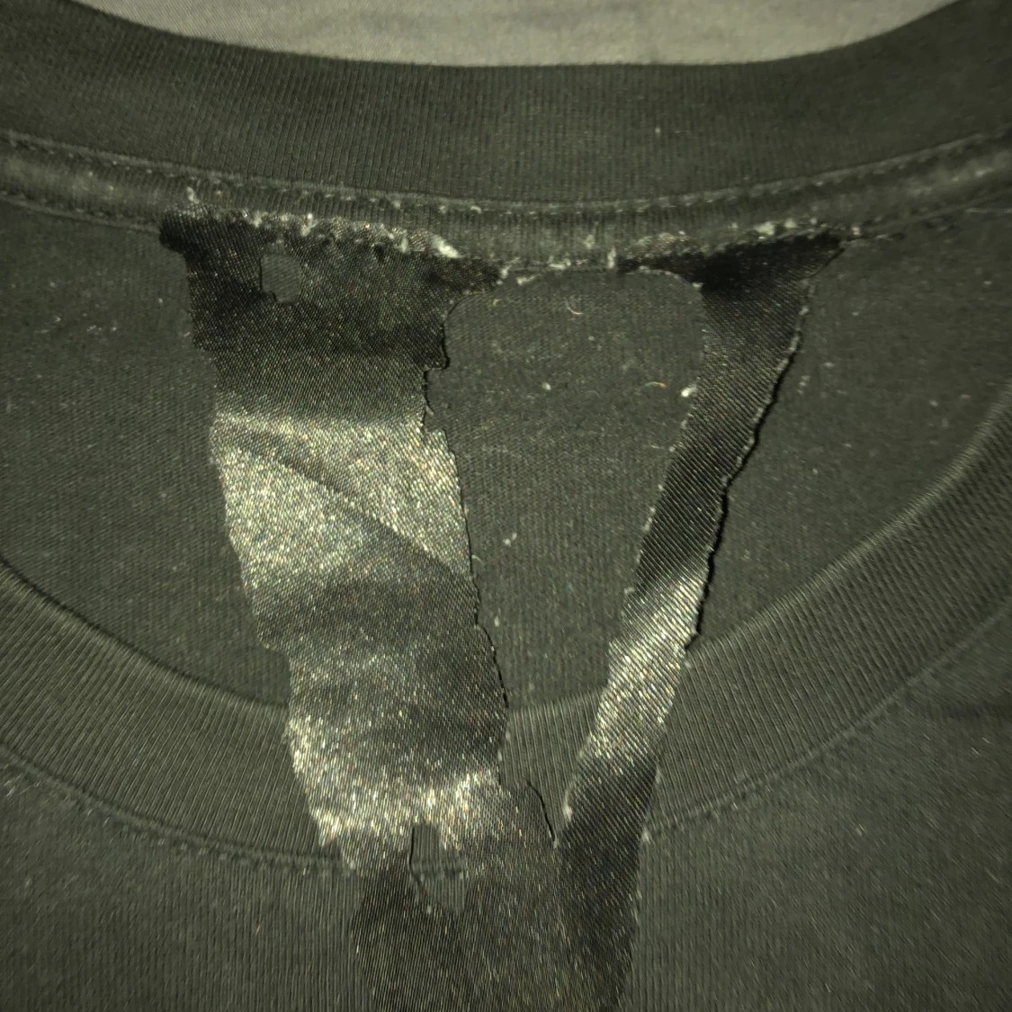 Svart t-shirt från Vlone med stor vit rökig V på ryggen och tryck med texten lone och med en ängel