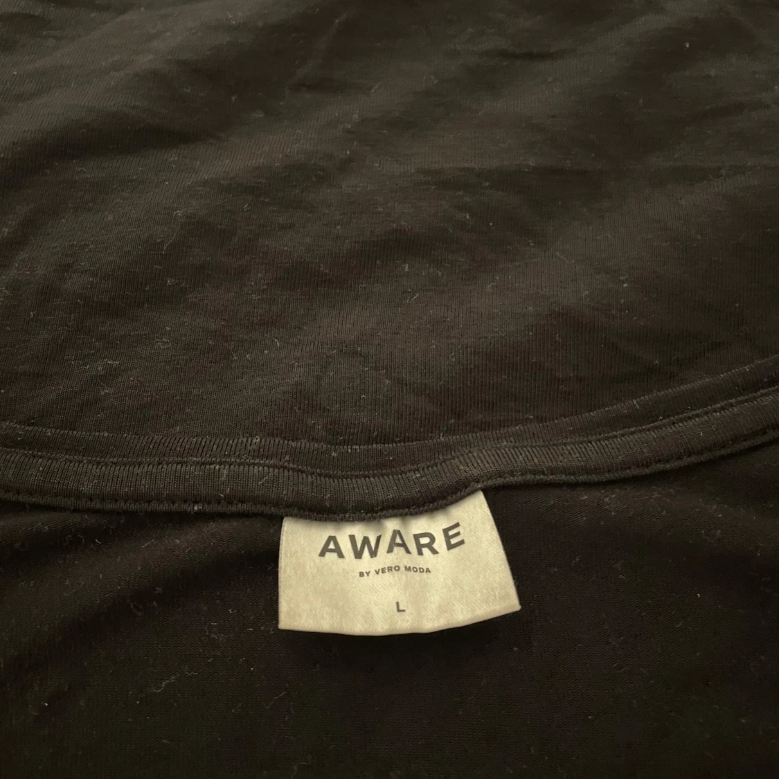 Svart t-shirt från AWARE by Vero Moda i storlek L. Modellen har v-ringad hals och korta ärmar, perfekt för en chill och enkel stil. Tillverkad i mjuk bomull som känns skön mot huden. Passformen är normal och funkar till de flesta outfits.