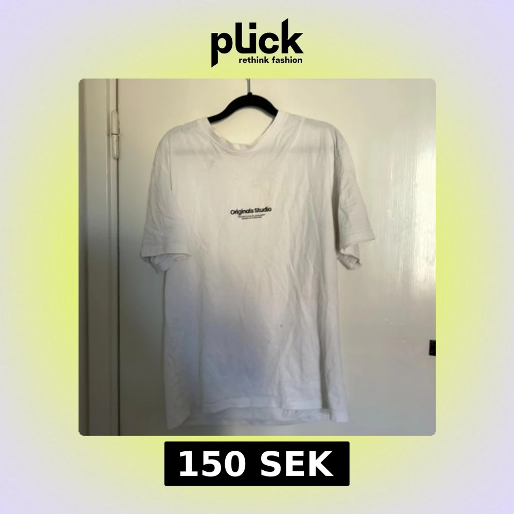 Säljer en klassisk vit t-shirt från Originals Studio med liten svart logga på bröstet. T-shirten har rund hals och korta ärmar, perfekt för en clean och enkel stil.
