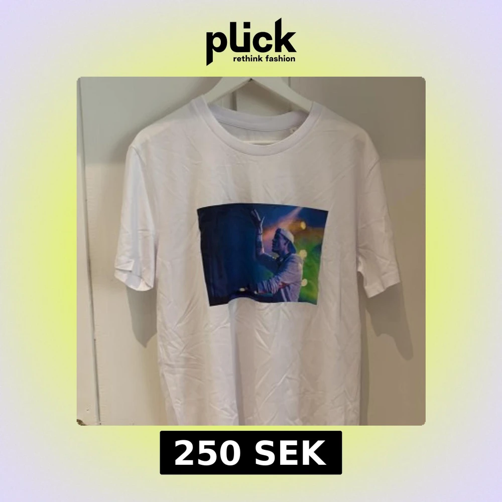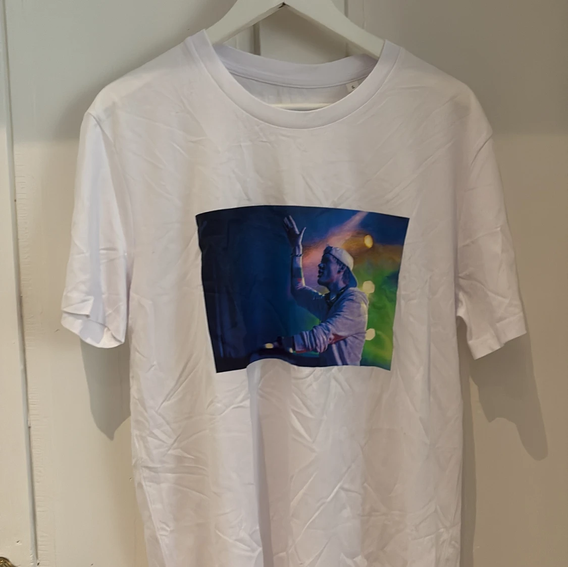 Vit t-shirt från Tim Bergling Foundation med tryck av Avicii på framsidan i färgstarka toner. Baksidan har en svart signatur och logga. Klassisk rund hals och korta ärmar, tillverkad i mjuk bomull. Perfekt för dig som gillar musik och vill ha en unik tee.