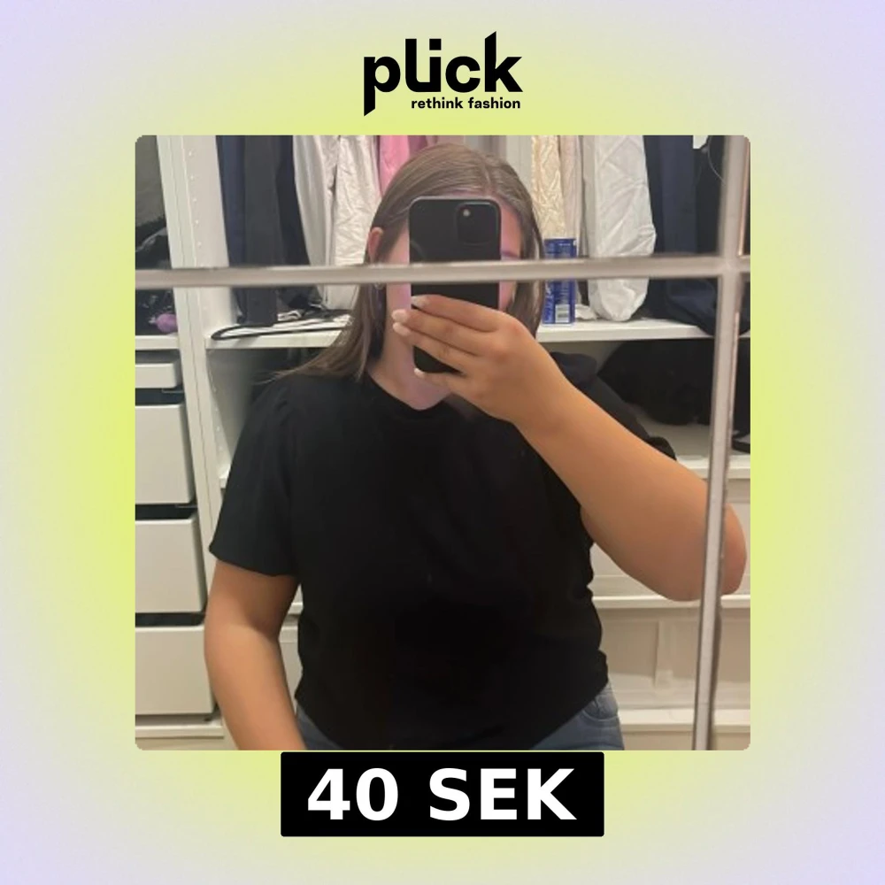 Enkel svart t-shirt från Stories i storlek L. T-shirten har rund halsringning och korta ärmar med lätt puff vid axlarna för en snygg touch. Passformen är normal och materialet känns mjukt och bekvämt. Perfekt till jeans.